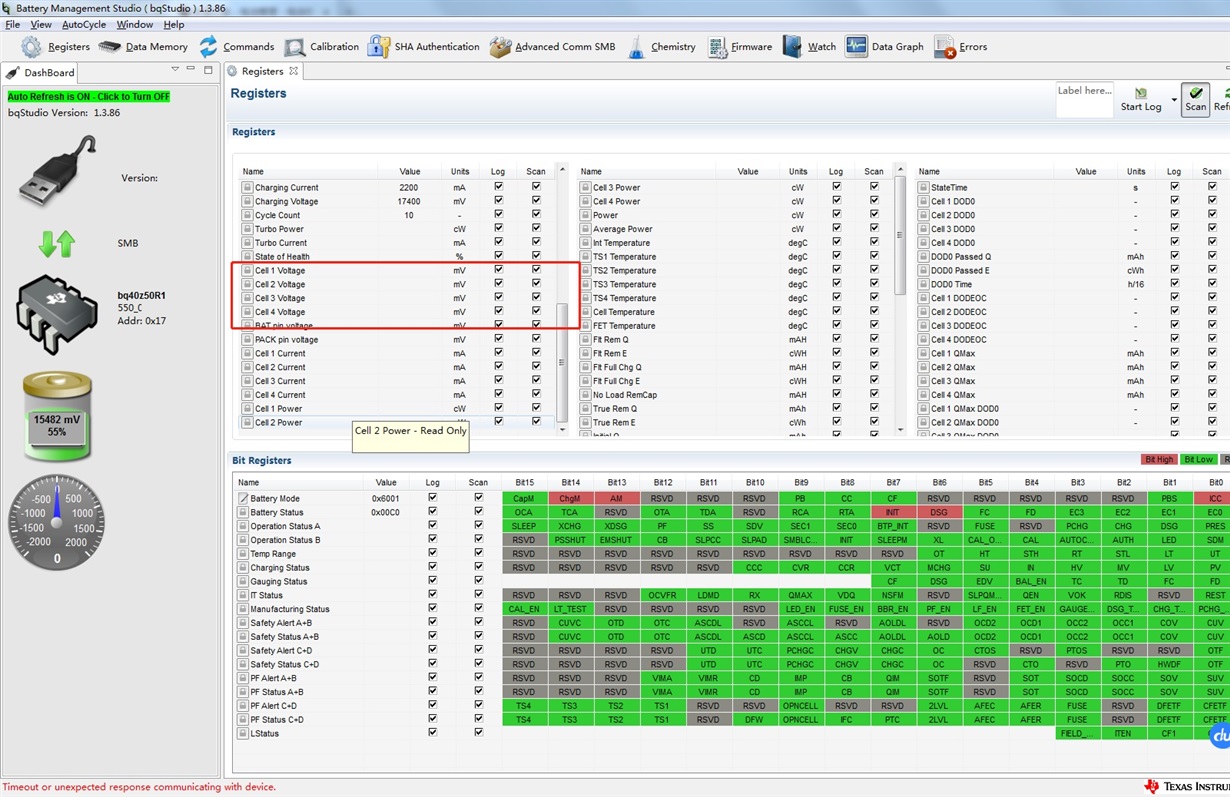我在淘宝上买了个EV2300,想测试下电池的压差,电池组是用4节电芯串在一起的,电池上电量计用的BQ40Z50R1,打开bq studio软件后总是提示timeout or unexpected response communicating with device,但是总电压跟总电流都能显示出来,每节电池的电压就显示不出来,为什么?