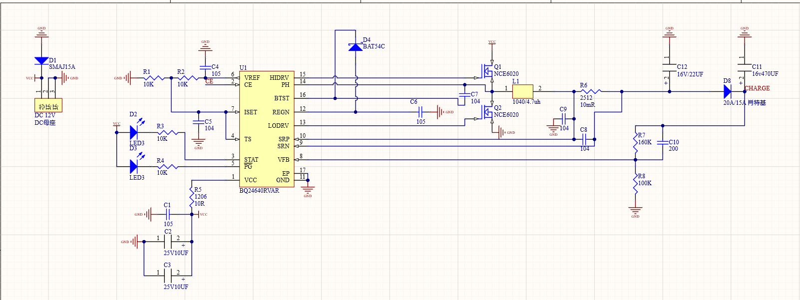 大佬们好,我最近使用BQ24640做了一个为超级电容进行充电的电路。目标是为串联5.4v的电容提供一个能输出8a电流的充电电路