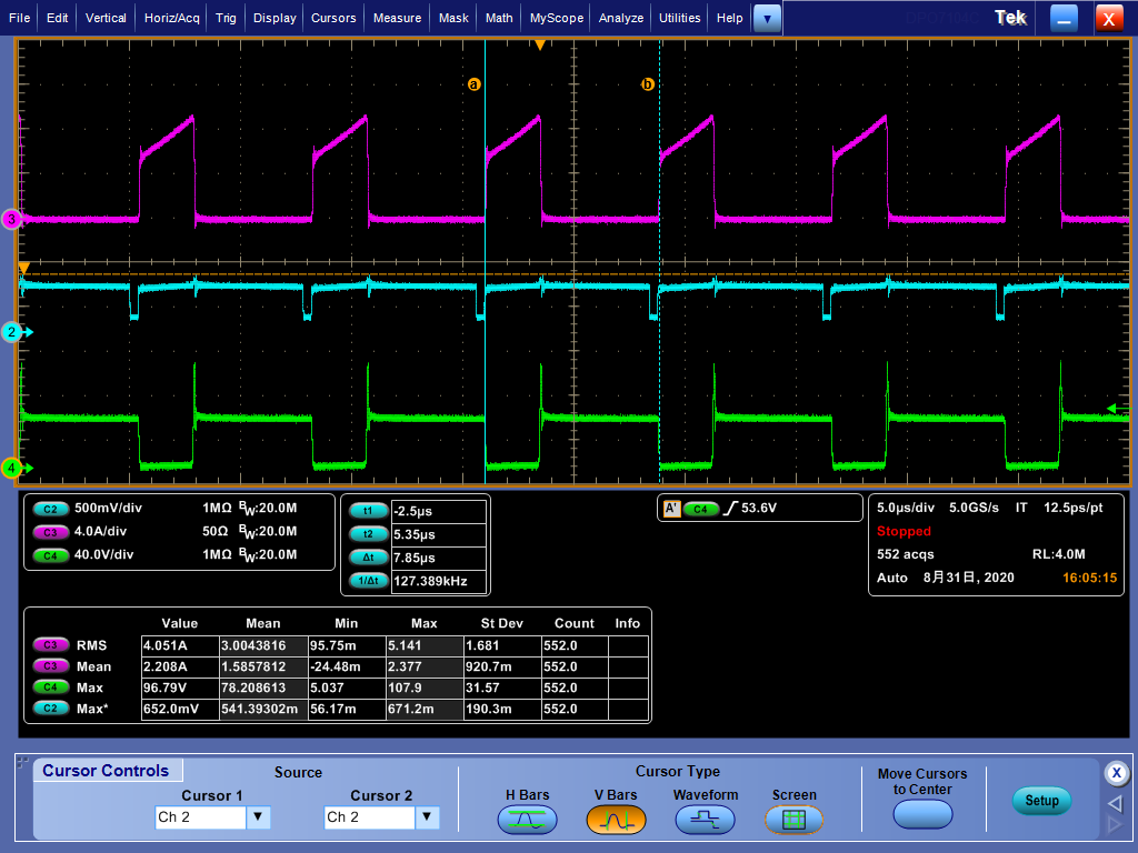 紫色是流经MOSFET的电流Id,青色是CS引脚的电压波形,绿色是开关频率波形。