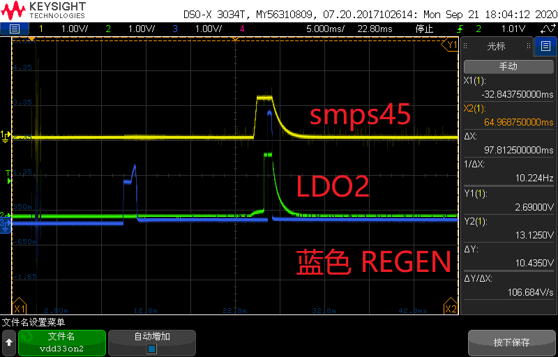 输入5v和3v3经测量都有输入进TPS6590376ZWSR,但F8 Regin引脚输出不连续,正常的应该是3v3输出。见附件测量的波形。