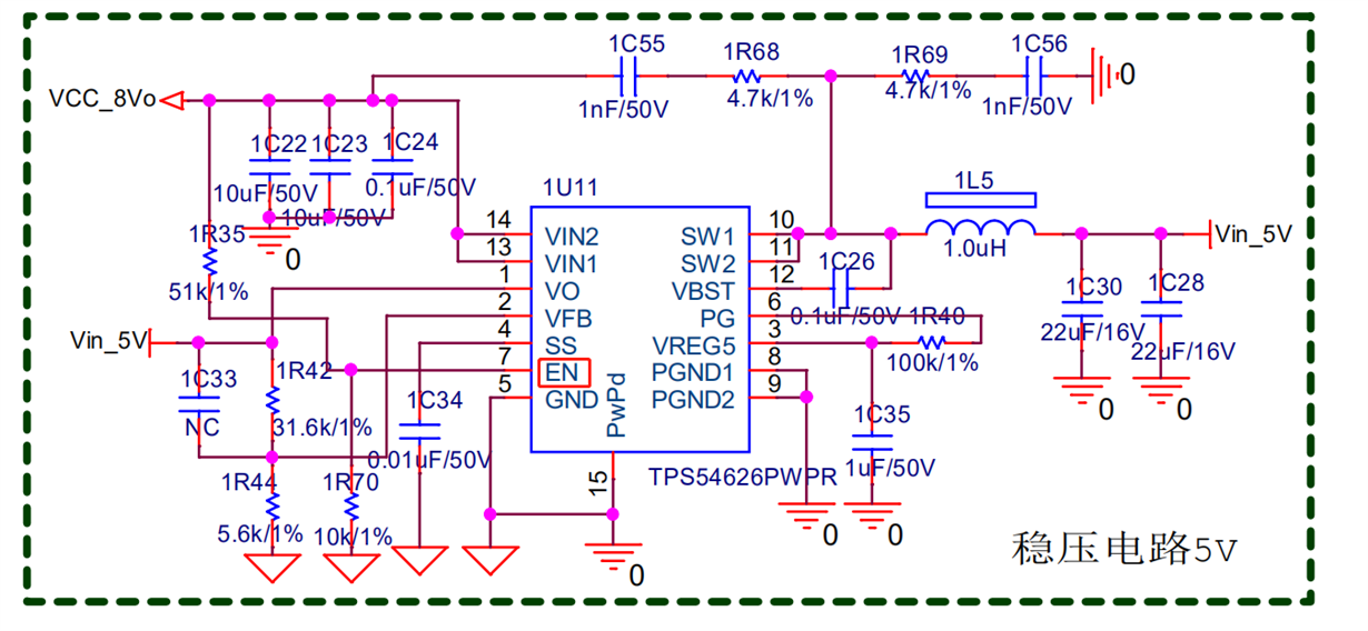 我这边是8V转5V 当适配器拔掉后,是由超级电容供8V的电 。超级电容放电不彻底彻底 ,设备不工作时超级电容两端还有6V左右的电压 ,虽然此时54626不再提供5V的电压 但是EN引脚还一直处在高电平,我再用适配器供电,会出现这颗IC不工作的现象 ,必须要把EN引脚的电压降低到某个值以后,才能工作。