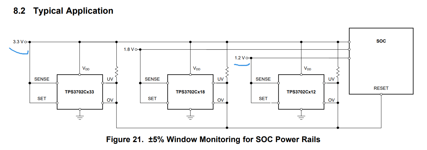 在进行TPS3702CX12DDCT芯片的原理图连接的时候,正常情况下,该芯片的SENCE引脚和SET引脚,应该是连起来的。但是我在研究咱们28388D的评估板的时候,发现,有个接法不一样,没研究明白,望得到支持。评估板中用到的监控芯片,SENCE接了1.2V,SET接了3.3V。这是出于什么思考呢?