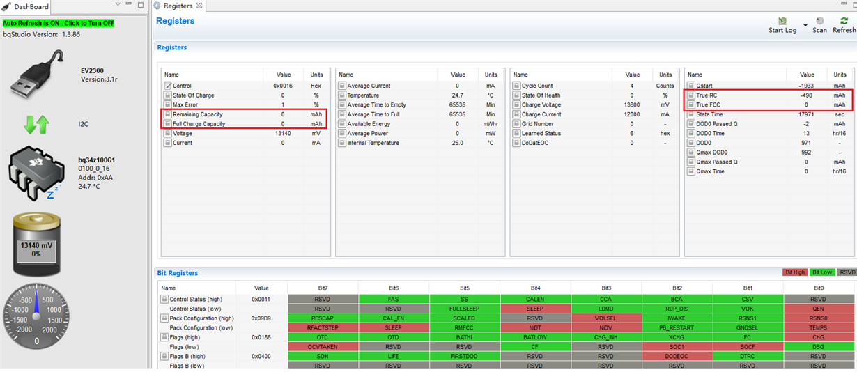 目前正在使用bq34z100-g,量产文件烧入后,有一台在客户使用过程中出现异常:剩余容量,满充容量均为0,Qmax Cell 0为-32623。电池是28AH(20小时放电)铅酸电池,如下图所示,麻烦帮忙分析下。