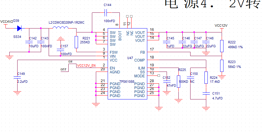 TPS61088 在做4.2升压12v时。输入电压在只有在4.2时输出电压才是12V,调节输入电压3.5时电压在10V。请问正常吗?能不能再输入电压在合法范围变化时,输出电压稳定12V。FB用的是499K与56K