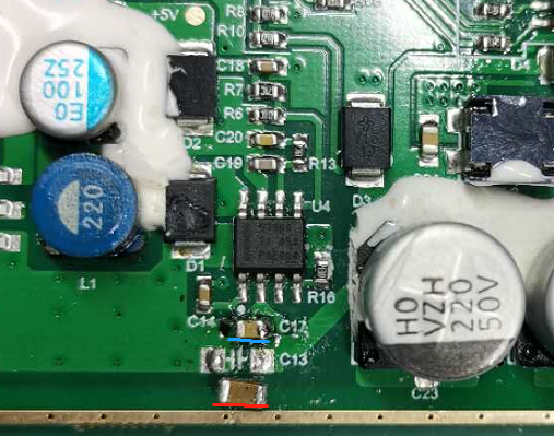 2.电源芯片前级稍远地方还有两颗220uf/50v电解电容,以及100nf/100v/0805/X7R瓷片电容两个,该位置电容未爆。