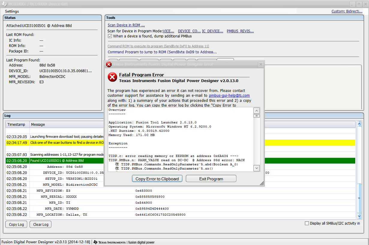 TIDP.c: error reading memory or EEPROM at address 0x6A434 ---> TIDP.PMBus.n: PARM_VALUE read on DC-DC @ Address 88d error: NACK