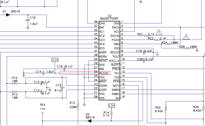 我用BQ20z75 v180做了一个3串的电池项目,板子提前测试好后,装上电芯发现有一定比例无法通讯,分析出来的不良为IC 26脚没有2.5V电压,打到电阻档测试发现26脚到地只有几欧姆,电容是好的,IC 8脚有3.3V电压,更换个IC就可以了。。