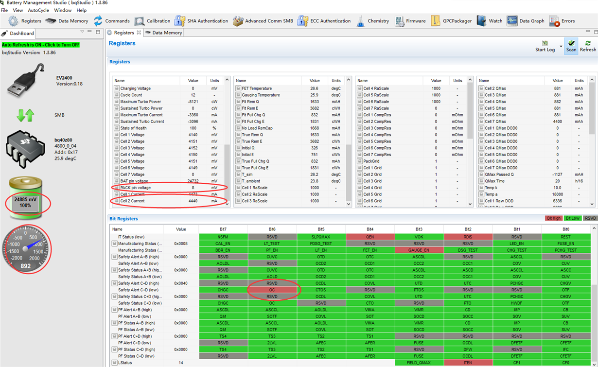 如图示 电池是6串 充满电状态 OC置位显示过充,但此时CHG、DSG都没有打开 可以看到pack也确实没有电压 但是显示有电流 而且还很大,仪表盘里面的电流因为我缩放5倍的关系和cell1...6 current显示其实是差不多的 另外 电流都已经校准过的