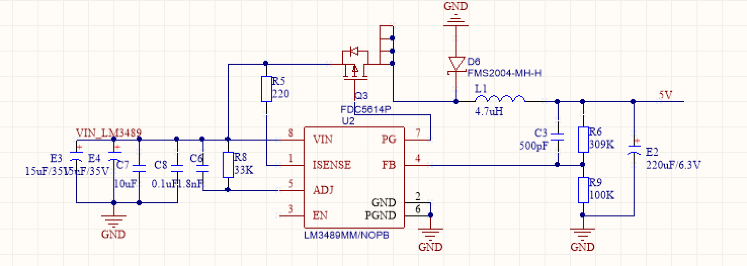 采用LM3489设计5V输出电路;测试过程中,VIN=13.5V,VOUT=5V,空载电流400ua,与手册上不符,请教大家