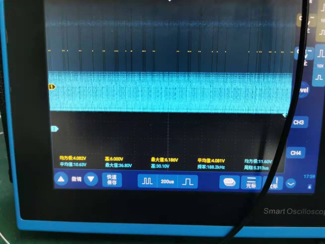 我的原理图见附件,测量的各个参数值为Vmppset=1.76V,Vts=2.9V,Vref=3.3V,VCC=23.52V,Vregn=6.25V,BTST处的波形如图所示,Vsrn=Vsrp=4.2V