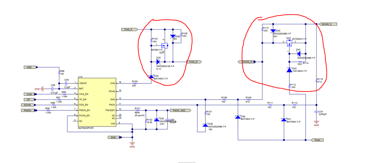 两个画圈的部分分别是CHG & DCHG MOSFET驱动的G ,S部分电路,这些器件是为了提高MOSFET关断速度吗?还是别的?