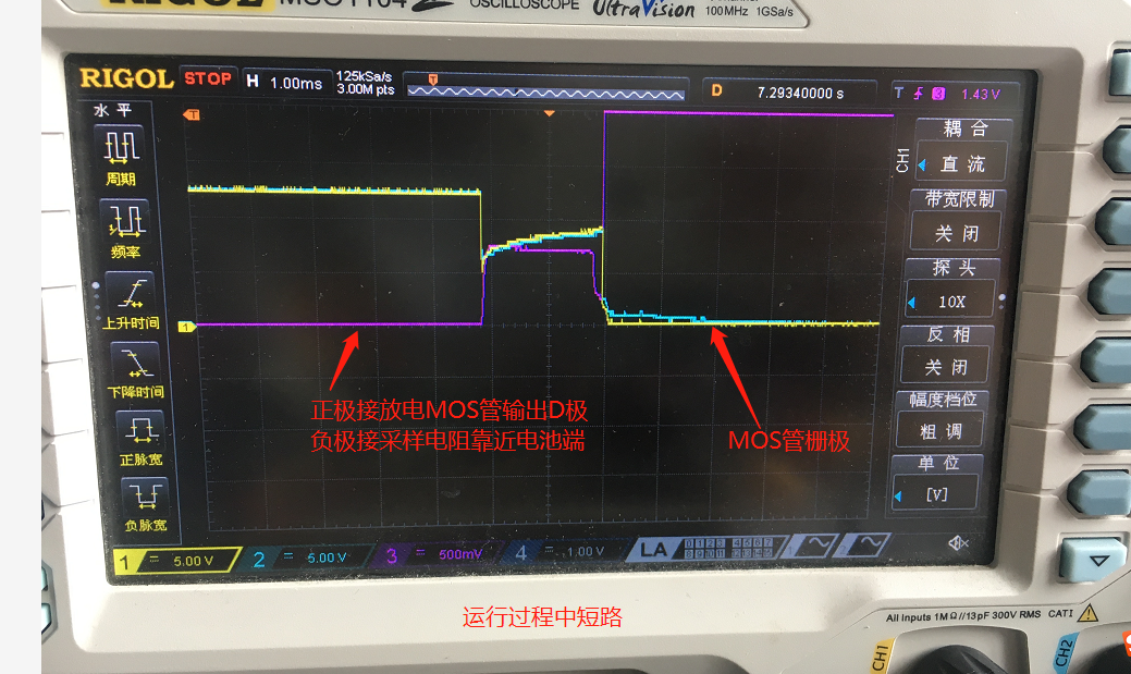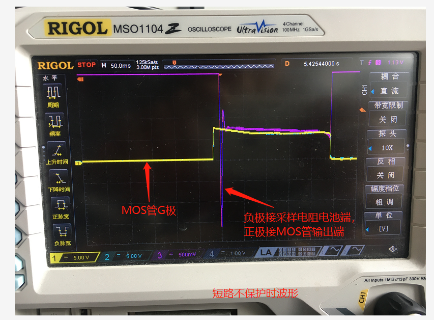 1. 在开启MOS管之前先把负载短路,再开启MOS 。示波器紫色波形为探头负极接采样电阻靠近电池端,正极接放电MOS输出端D,短路电流峰值超过1000A。时间超过250MS都没有保护,直到母线烧断,MOS管没有损坏,能正常工作。黄色波形为MOS栅极的电平,一直为高电平。