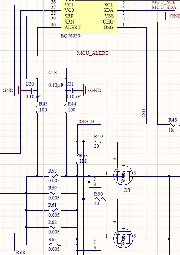 2. The schematic shows some circuit between DSG from the BQ76930 and DSG_G the common feed to the FET gates. Be sure there is no unexpected delays to the gates.