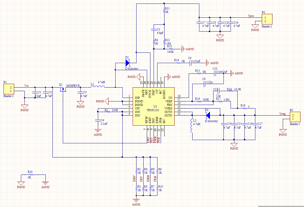 现在发现VPOS可以正常输出12V,而负极VNEG输出的则为3.33V,经过测试,VREF=1.22,而VFBP=1.40V,我看手册上写的VFBP应该是0V,为什么这里会有电压? 另外芯片背面有发热现象。