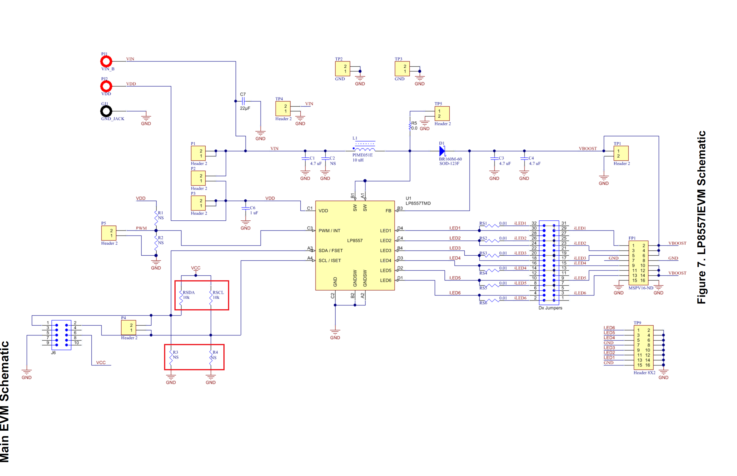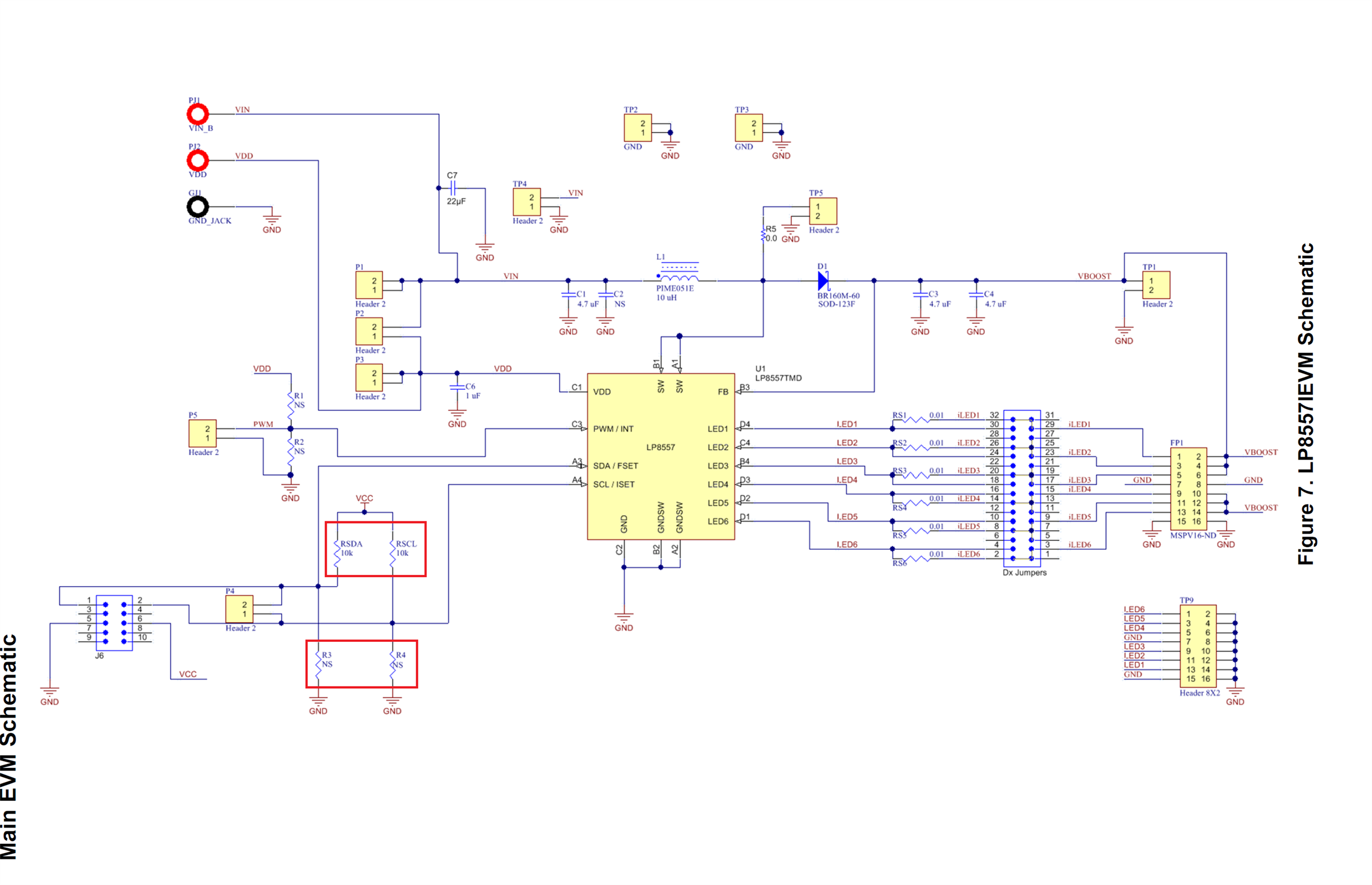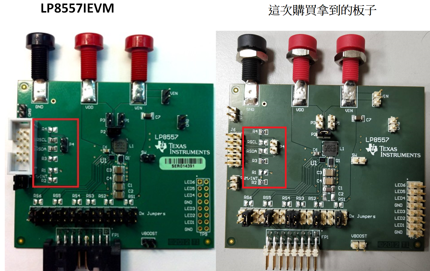 再來,我比較了LP8557IEVM規格書上的電路圖(附件圖片),電路上的I2C應該要是接10K電阻接VCC,Pull High,這樣I2C才能通訊,發現我的板子是錯誤的,