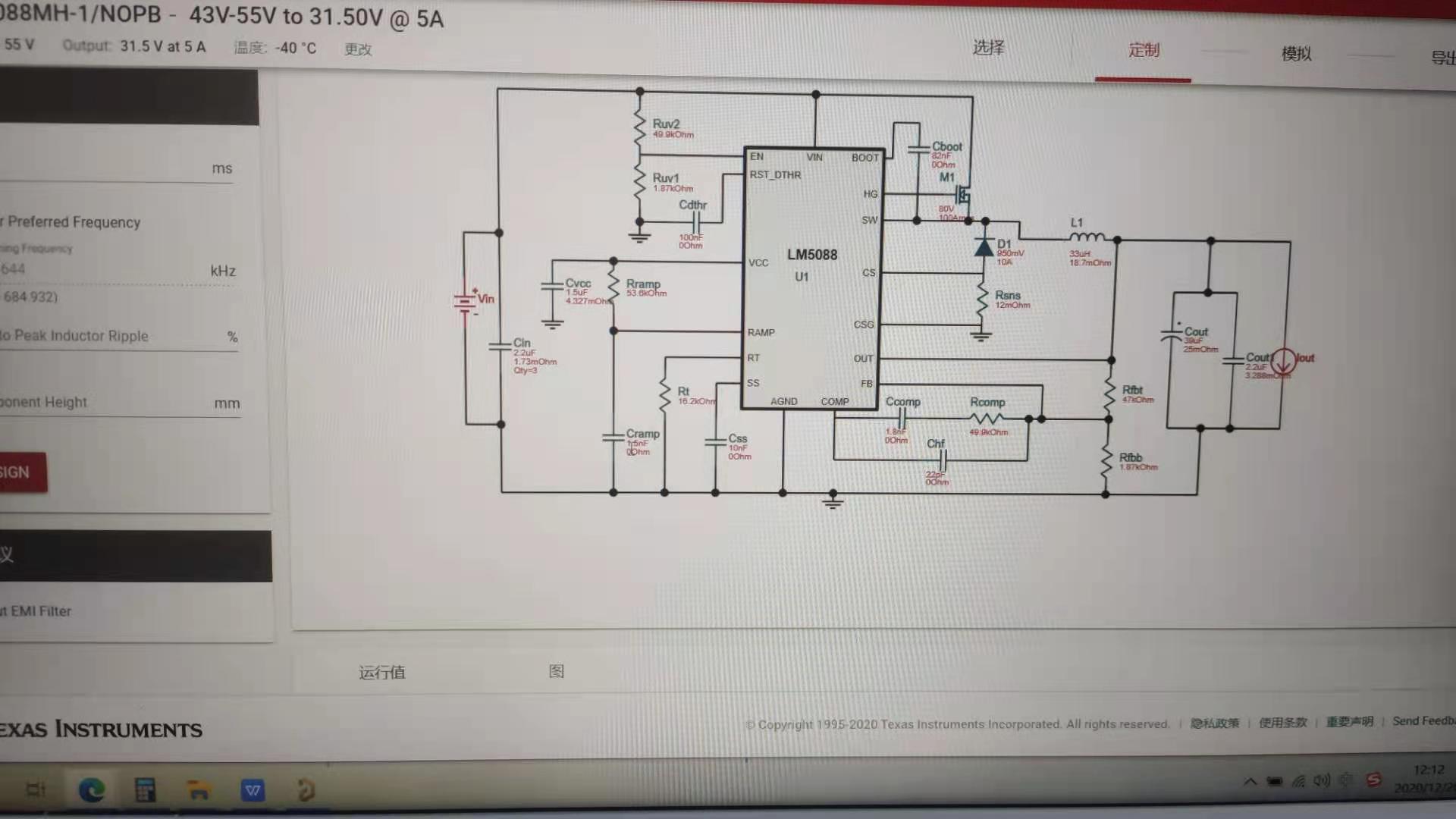 各位大大好,我在使用LM5088时出现一个问题,在常温时开关芯片能够正常工作,但在做-40℃的低温测试时发现芯片在带载启动时,电压会被拉低,有的甚至直接无法启动,使用的电路是官方的电路,元件参数是根据参考设计的,在输入电压在43v的时候直接就启动不起来,在48v以上能启动起来但输出的电压会被拉低一些,输出31.5v会被拉低到29v,主要是什么原因导致的呢?加大输入电容也没效果,是反馈环路的问题吗?