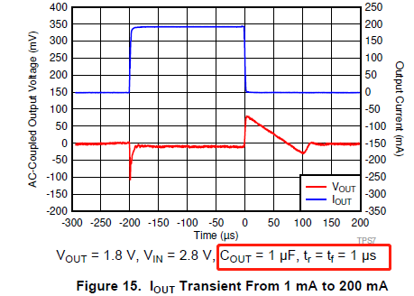负载动态变化,对于输出电压的影响,反应的是环路响应,所以这是必然会造成输出电压的变化,因为电压不可能瞬变。Tr和Tf反应的是负载变化的时间,变化的幅度是1mA到200mA。(当然也可以1mA到1A, 这样变化幅值将远大于1A/uS, 前提是这个LDO能输出1A)