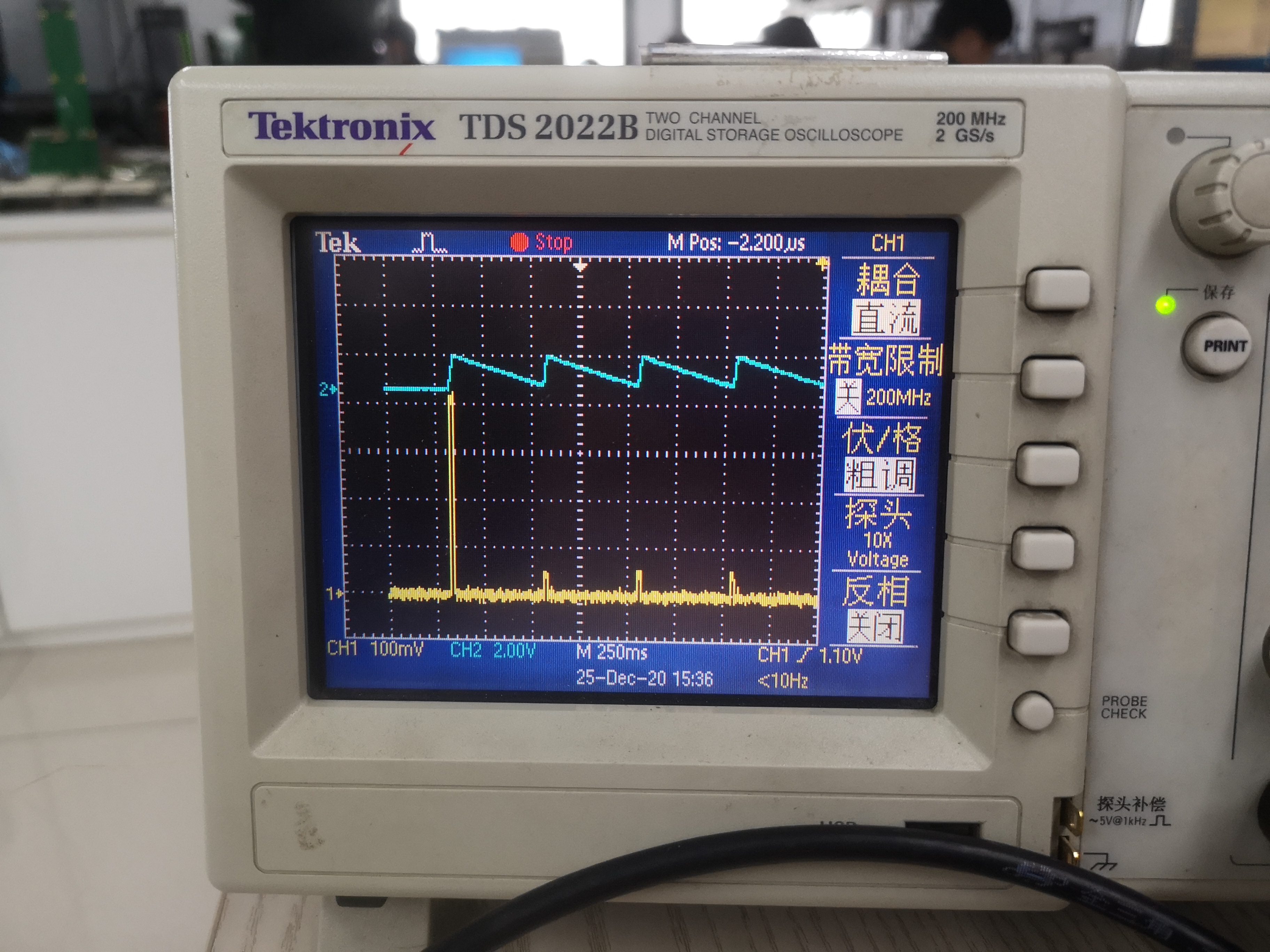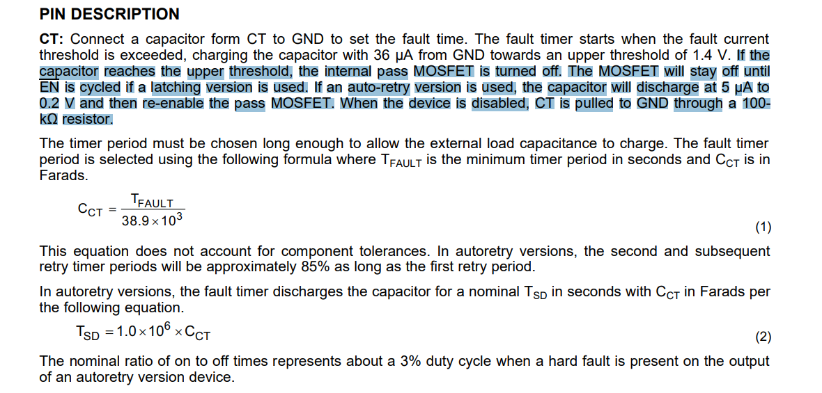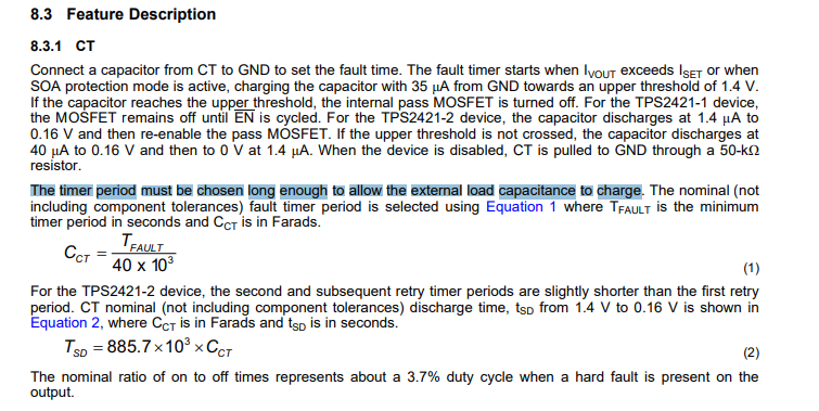最近项目使用TPS2420做过流保护,发现过流不符合预期,使用官方DEMO板测试也不符合预期,具体如下图(使用官方DEMO板测试),黄色一通道是电流(通过0.1Ω电阻串联测分压,即100mV对应1A电流),蓝色二通道是CT脚,对DEMO板用12V上电后正常输出12V,官方DEMO设置的保护电流是4A,故我们将负载仪设置为4.1A然后打开负载,可以看到在CT设置的时间内(DEMO板设置约22.5ms),板卡正常流过4.1A电流,然后保护关断,CT脚电容循环充放电尝试恢复正常导通,由于负载仪始终打开为4.1A负载,故每次都启动失败,按照手册描述,每次尝试启动的Tfault时间内,板卡应该按照4.1A电流导通,但是实测除了第一次是按照手册预期的4.1A外,其他时候都是只有0.5A左右电流导通;另外如果先将负载仪的4.1A负载打开,然后再给DEMO板上电,实测每次尝试启动的Tfault时间内,导通电流也是0.5A左右,还请帮忙分析原因,谢谢