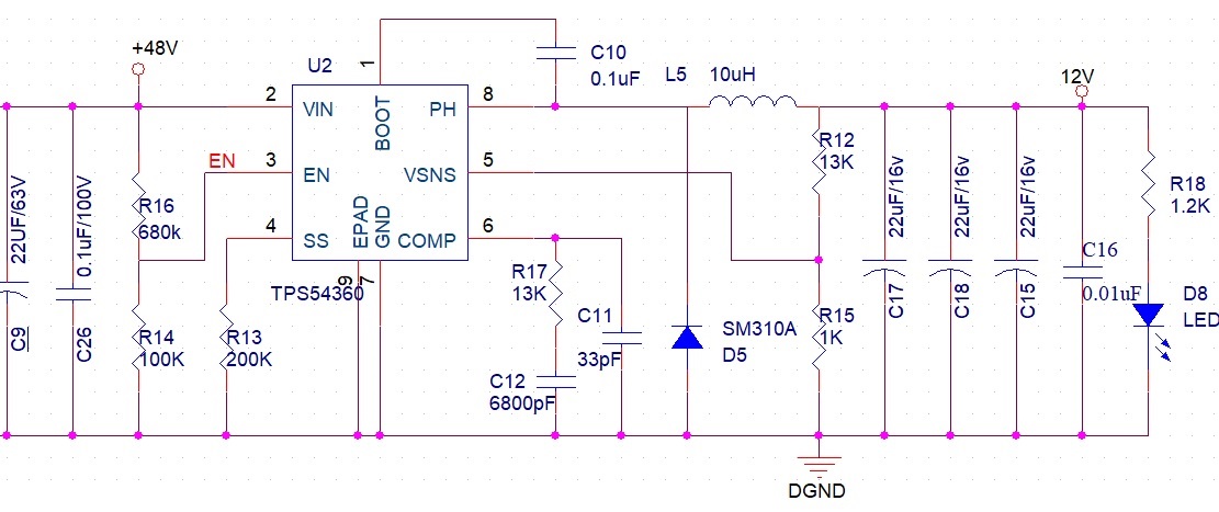 各位前辈好,我有一款板子用TPS54360,+48V输出,10.5V输出,常温下,电源芯片工作正常,在做高温老化时(+60℃,空载),100张板子有4张板子 VIN脚烧毁,PH脚对GND短路,请帮忙分析一下是什么原因?谢谢