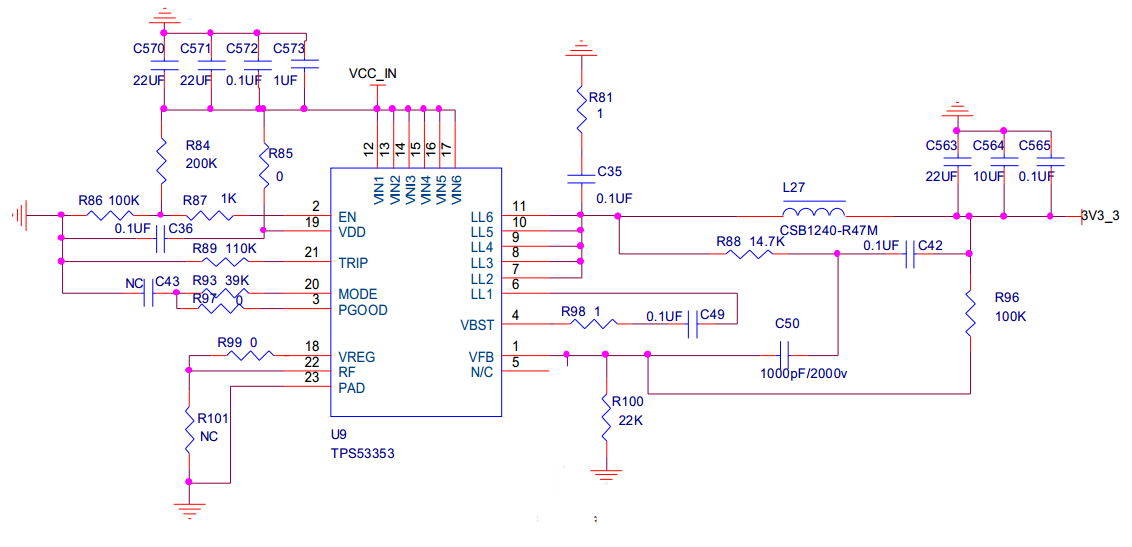 我使用TPS53353设计了一个降压电压,输入12V,输出3.3V,原理图如下,但验证发现输出仅仅有0.4V,这是什么原因导致?