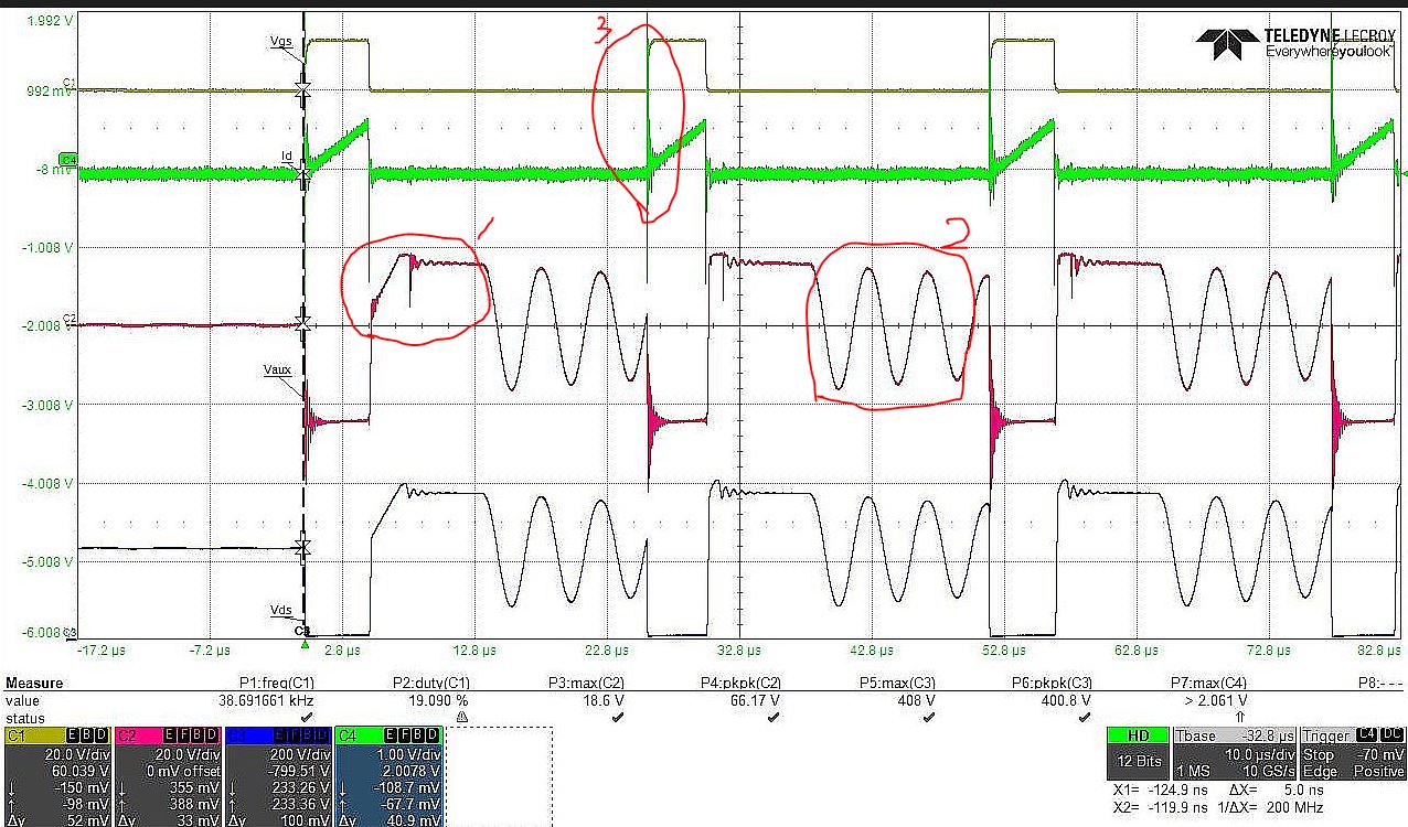 2. 以前在二次侧放完电流,一次侧由变压器电感与MOSFET的Coss形成的震荡,其震幅会慢慢减小,但我这次的电路似乎不会