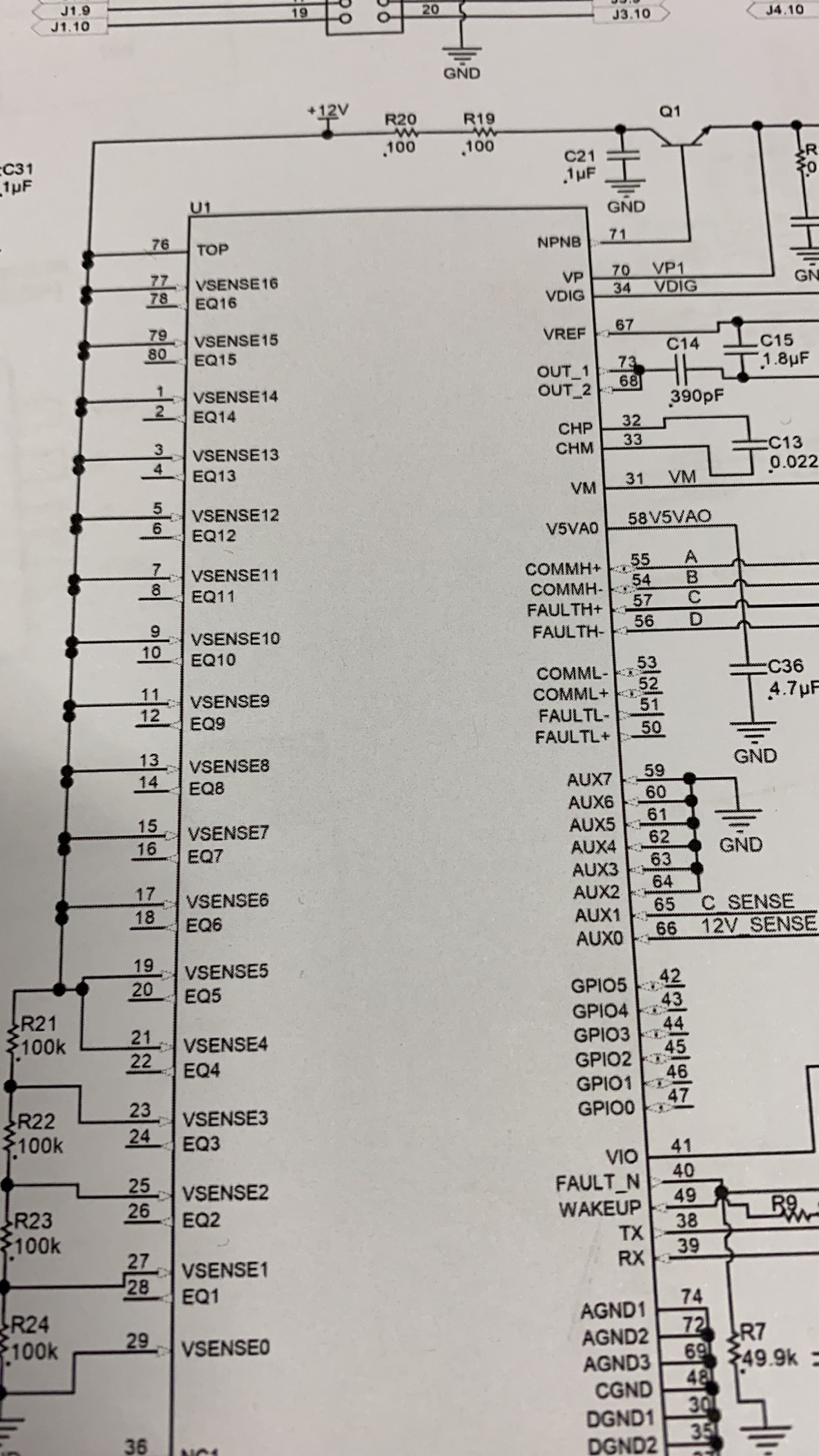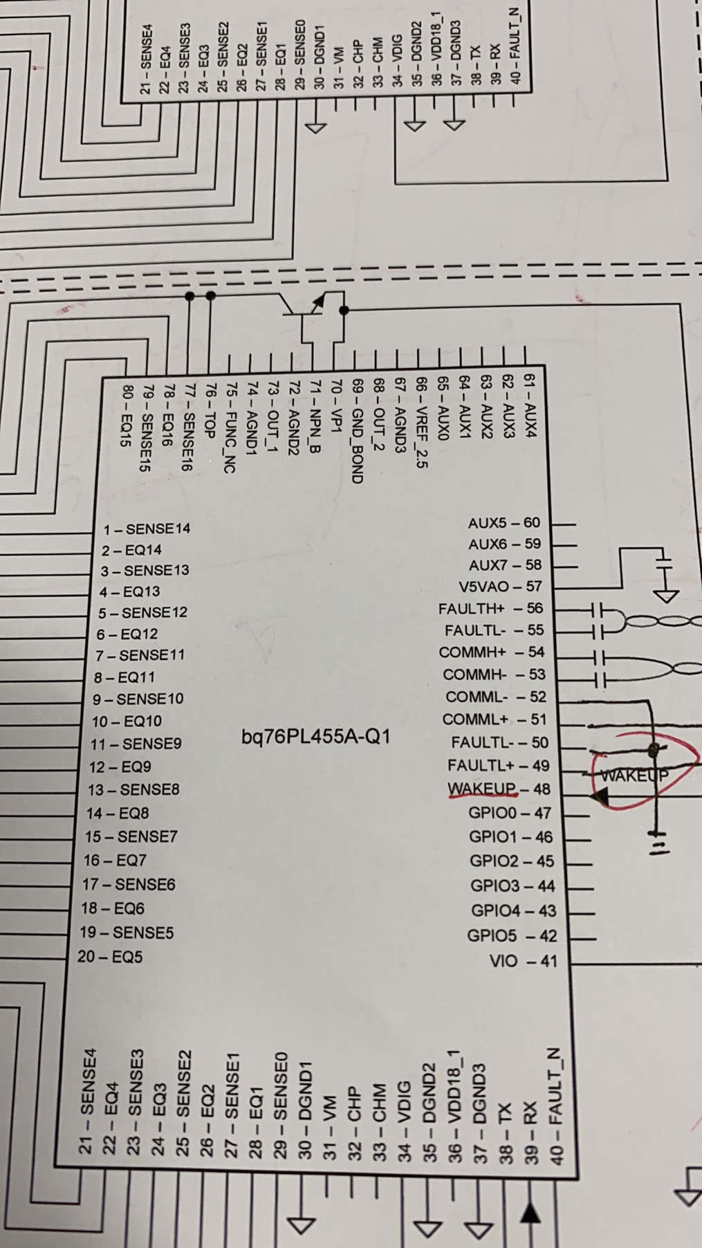 1. 我们用5个BQ76PL455A做80串级联,请问第一颗的COMMH- COMML+,最后一颗FAULTL-, FAULTH+引脚该怎么处理?