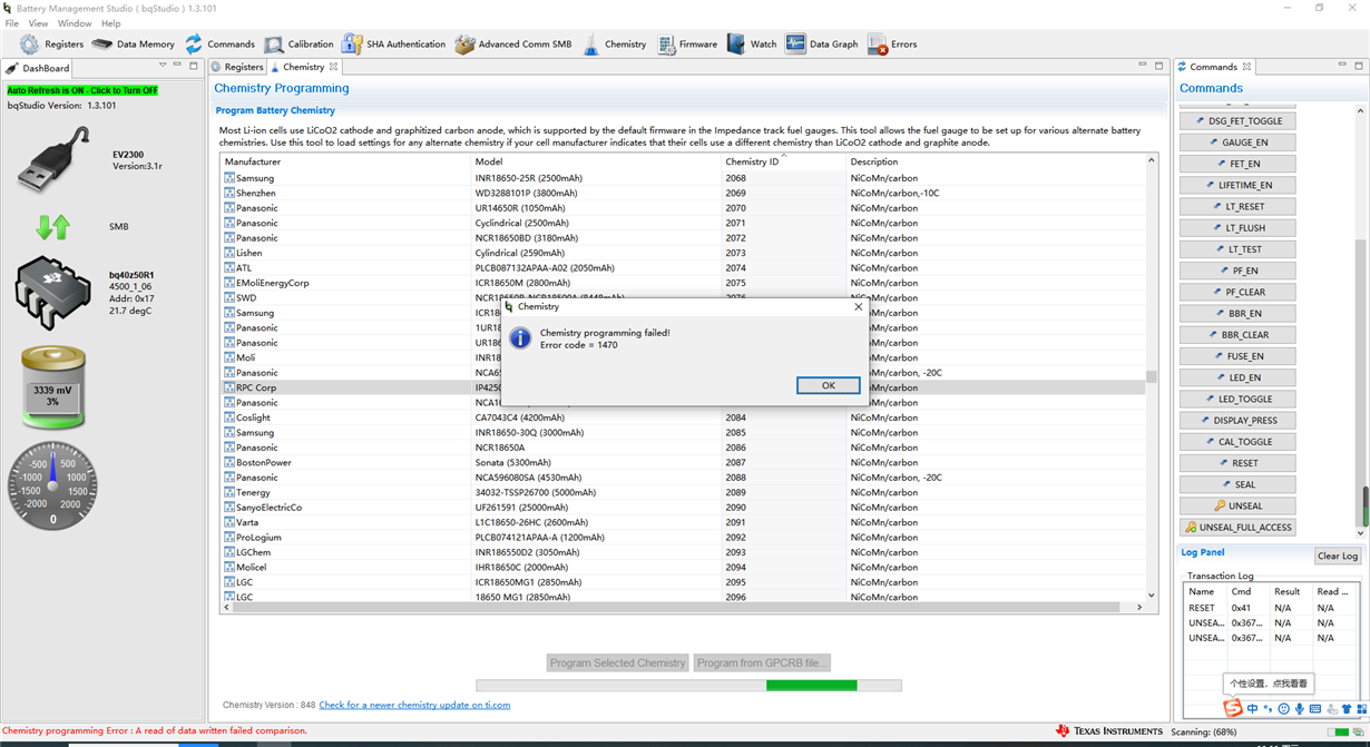 我现在用BQ40z50-R1做一款电芯的化学ID学习,化学ID已经得到(2082) ,但是就是无法写入。重启电脑、更新CHEM-ID库、甚至重新烧录BQ40Z50-R1的 serc1文件都不能写入,请帮忙看看什么问题,如下图