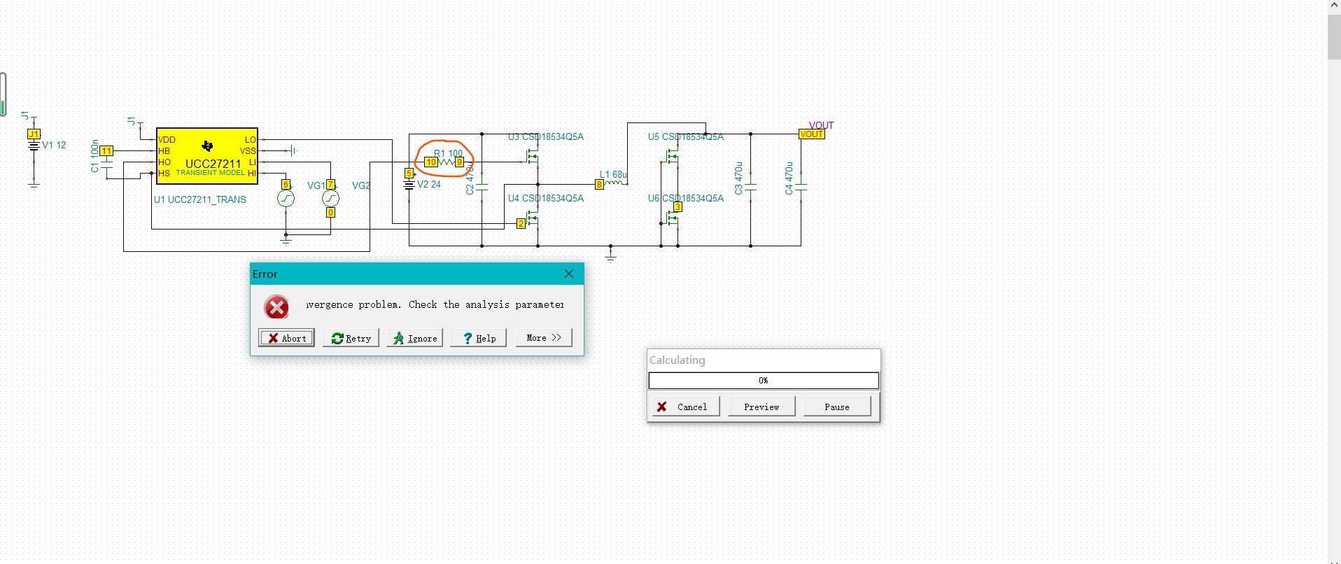 如上这个电路图,我在驱动芯片高端输出和MOS的栅中间加一个电阻仿真就会出现问题,为什么啊?(瞬态仿真50 us)