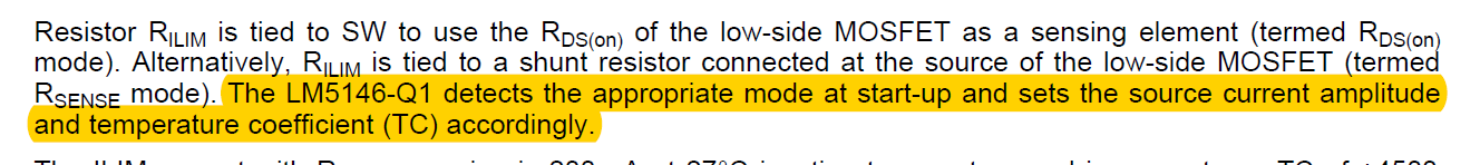 Datasheet中关于过流保护模式的介绍有两种,一种是用下管的Rdson作为检流电阻,另一种是在下管和地之间串一个检流电阻Rs。芯片自己会在启动的时候判断外部接的模式,如下图。但是具体是如何实现模式区分的?