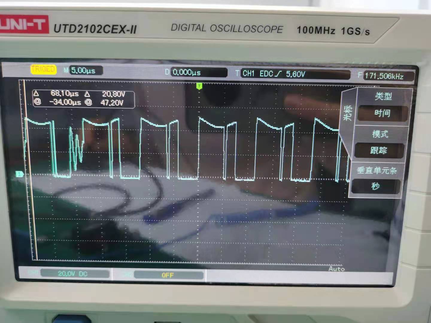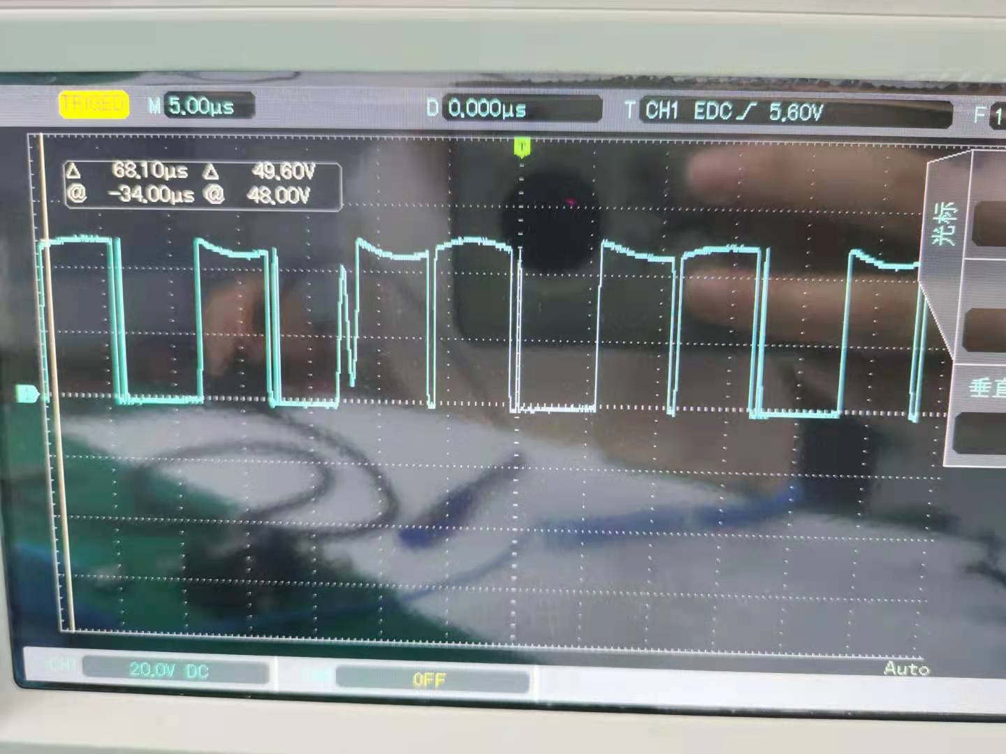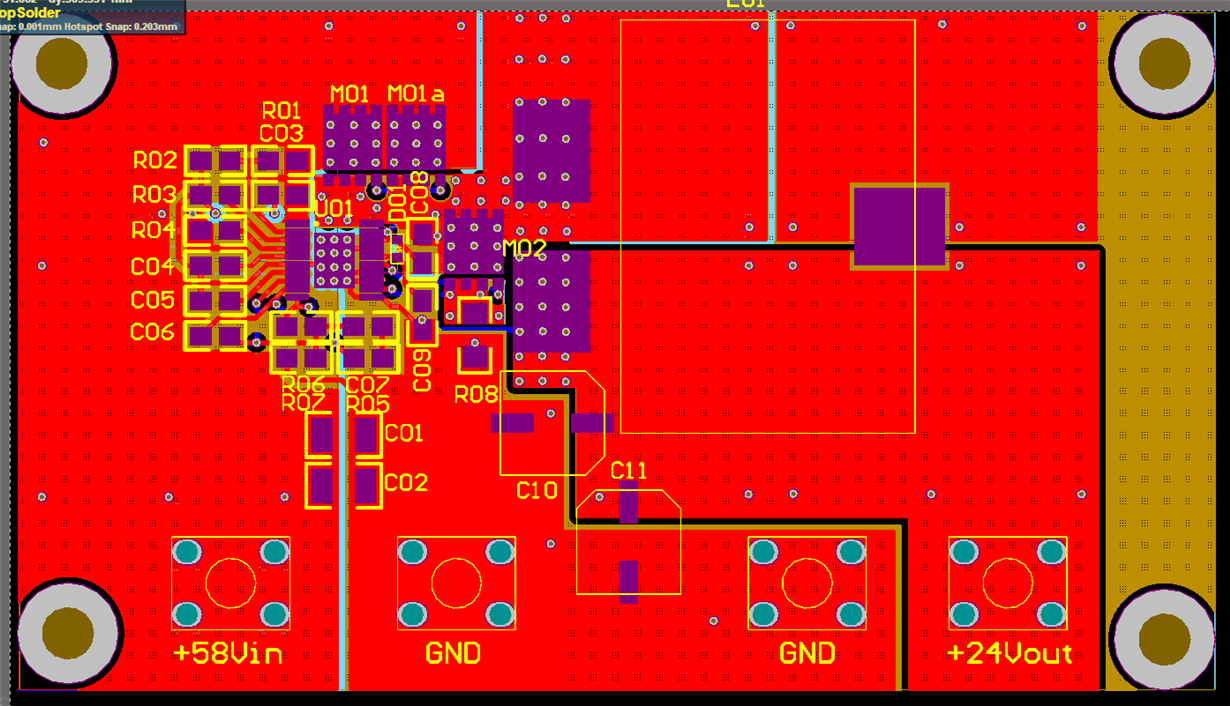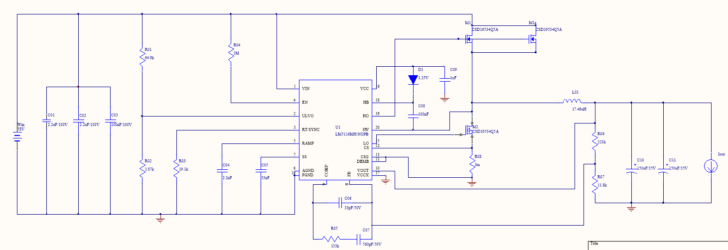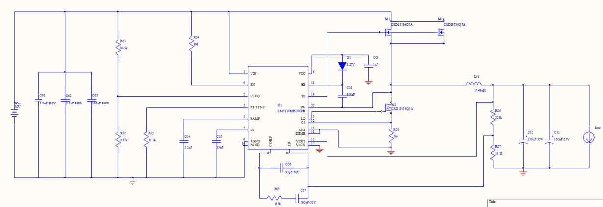 LM5116负载能力不足,设计要求输入36-58V,输出24V12A;用锂电池供电55V(电流可达200Ah),输出端接电子负载,只有电流调节到1A左右时电压从24V就降到十几V,请问什么原因,用直流电源供电40V输出电流可以达到8A才会压降,波形图为SW脚