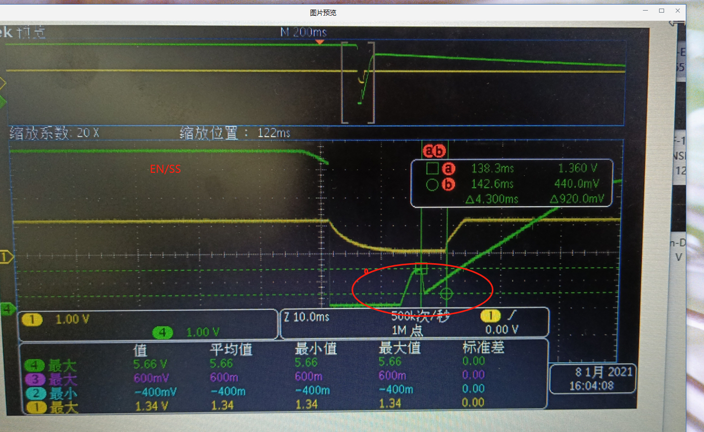 TPS56121工作时EN/SS引脚上电会达到5.6V,另外掉电的时候EN/SS引脚也会反复启动,示波器测量出EN/SS引脚的波形图如下