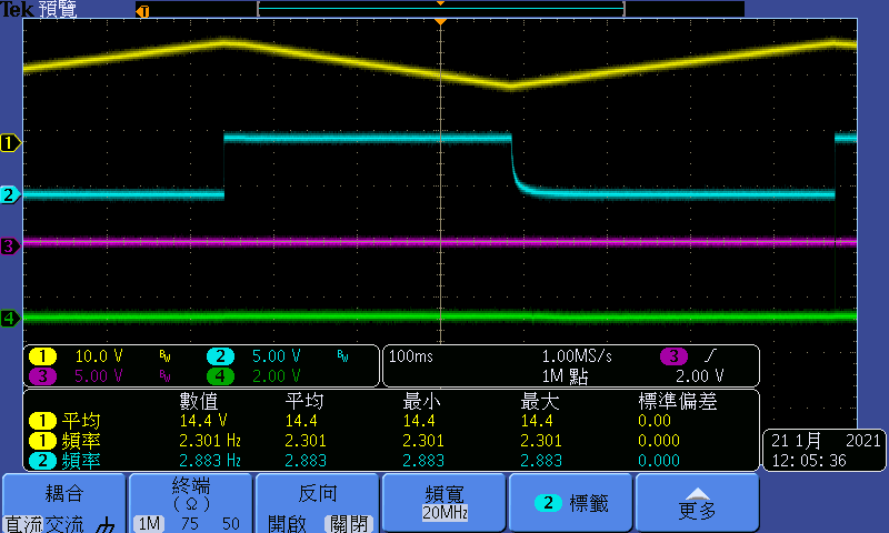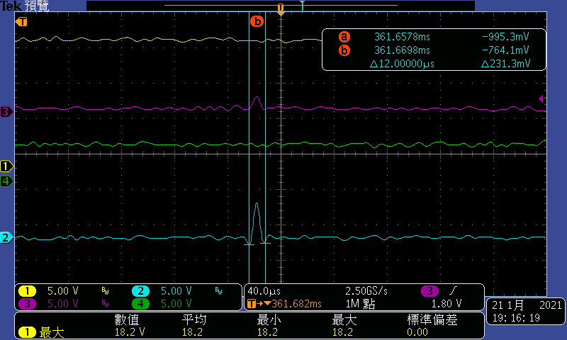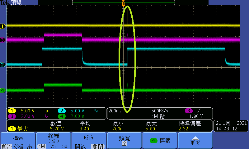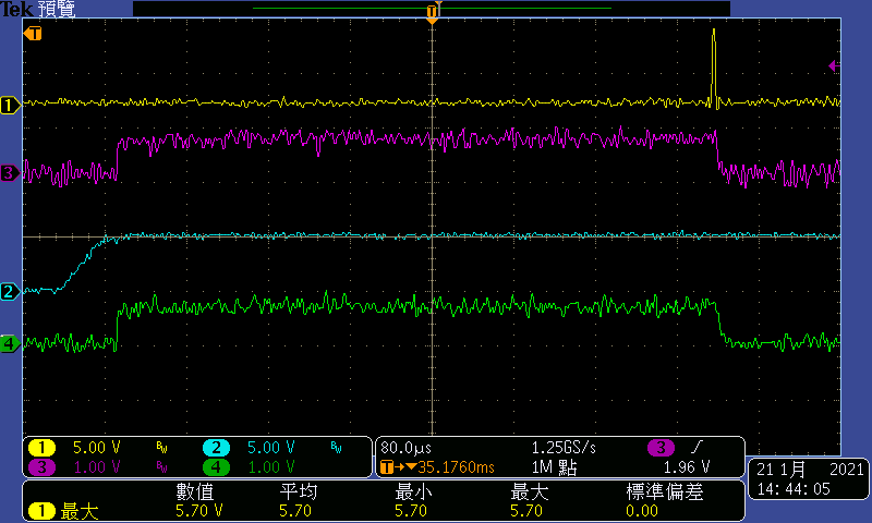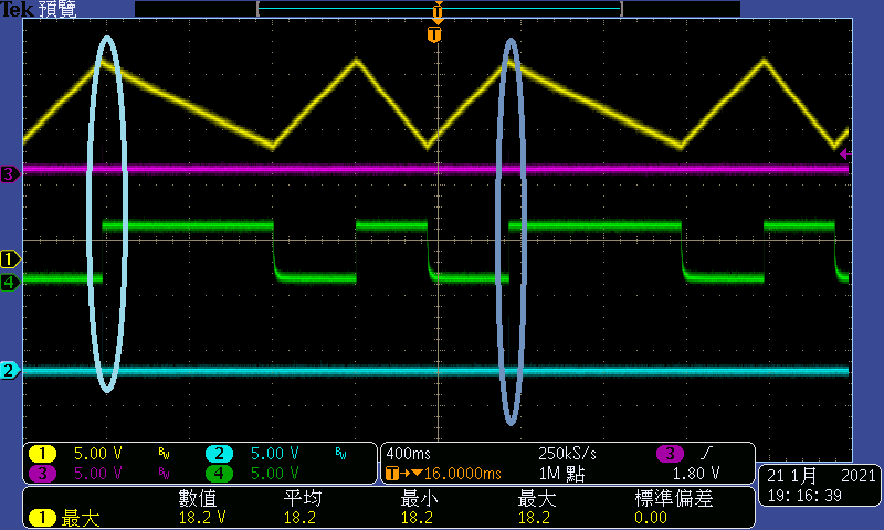 黃色是Vdd的訊號,紫色是我經過DRIVER(ucc27712)給mosfet(mosfet的型號是ixft44n50)的訊號,綠色是ref,藍色是ic(ucc28780)給出的訊號,從圈起來的地方可以看見是有pwml訊號的輸出的。