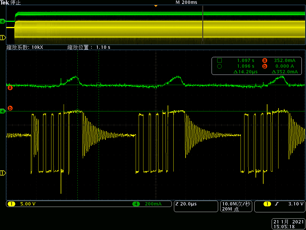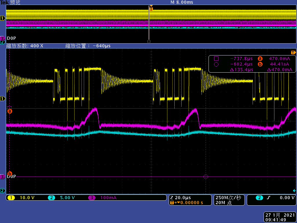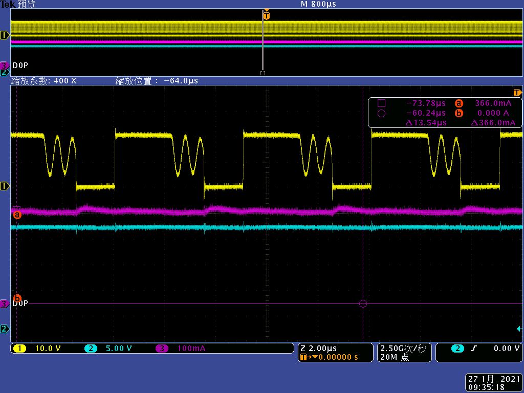 通过示波器测试输出电流和SW,发现SW处于diming mode,输出电流波动和SW的方波信号有一定关联性。请帮忙分析输出电流偏大的原因。谢谢!