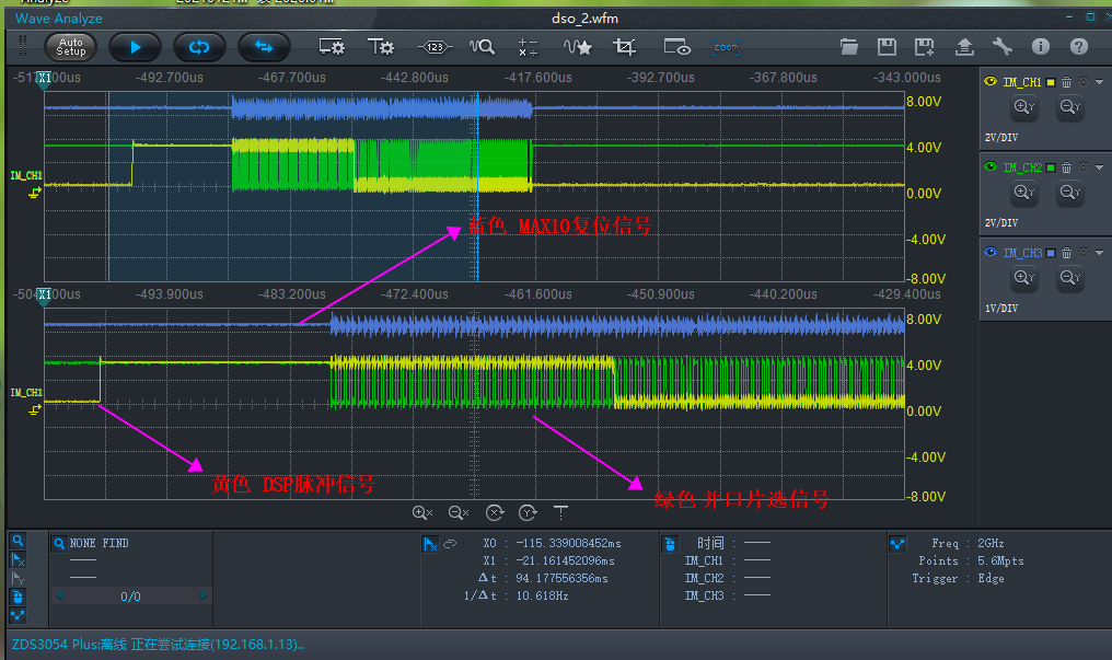 本人最近用TPS3823-33DBVR做一个系统,这款复位芯片目前上电同时给一块DSP芯片、一片FPGA芯片和一个通讯模块进行复位,现在发现当通讯模块与DSP芯片之间进行并口数据交换时,TPS3823-33的复位引脚上出现很重的毛刺,具体如下图蓝色波形所示,请群里的各位大神帮忙分析下是什么原因引起的。是否存在3823的驱动能力不够?