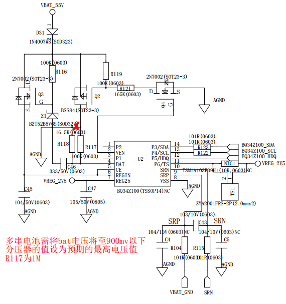 2. 目前我的电池电压时55V的,通过外部降压给bq34z100的bat。如图所示外部供电为51V,那么bat管脚的电压为6.8V,那么在校准过程,我要将voltage总电压校准成51V,还是6.8V,这就影响这我的term voltage等参数的设置。