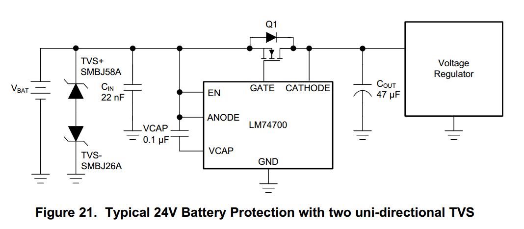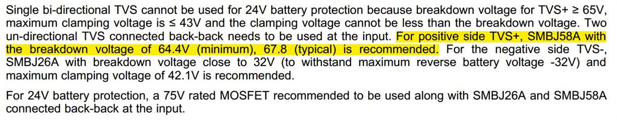 我已经看过了datasheet中10.1.1.4 Selection of TVS Diodes and MOSFET for 24V Battery Protection Applications 关于TVS管的选型推荐。我之前询问问题其实也是基于这个TVS管推荐。