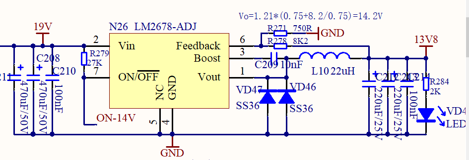 LM2678带1.5A负载启动电压无法达到设定值,并且电感啸叫,测量波形,发现电感前波形特别乱;如果先启动再加负载就正常了,负载可以达到5A。原理图如下,电感使用的是MSS1278-223MLB