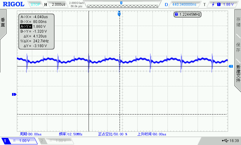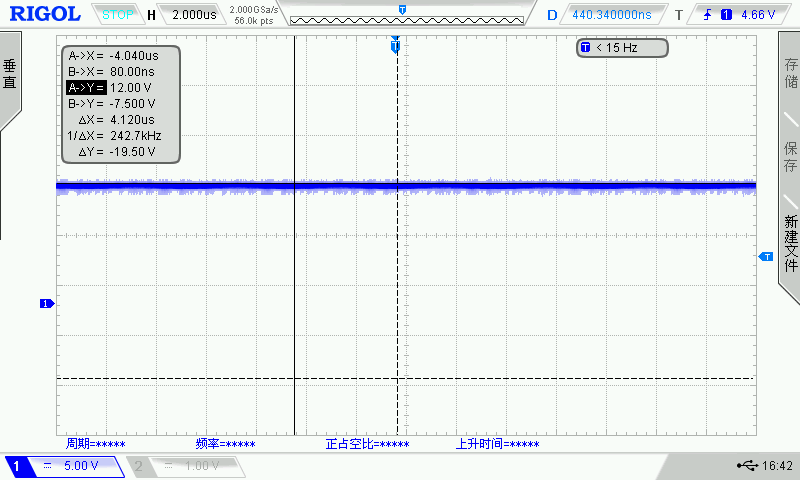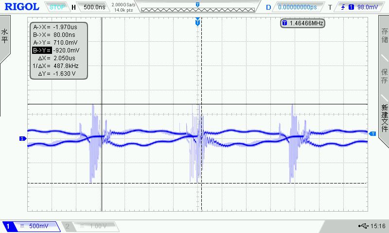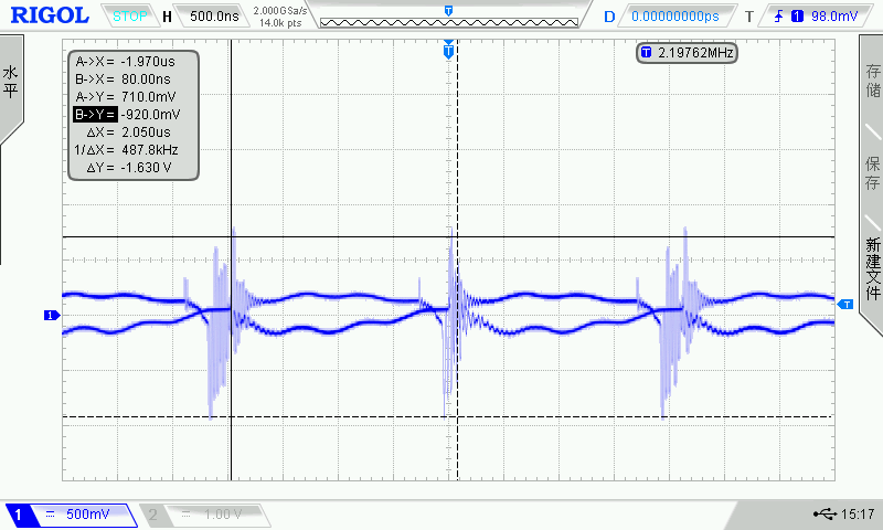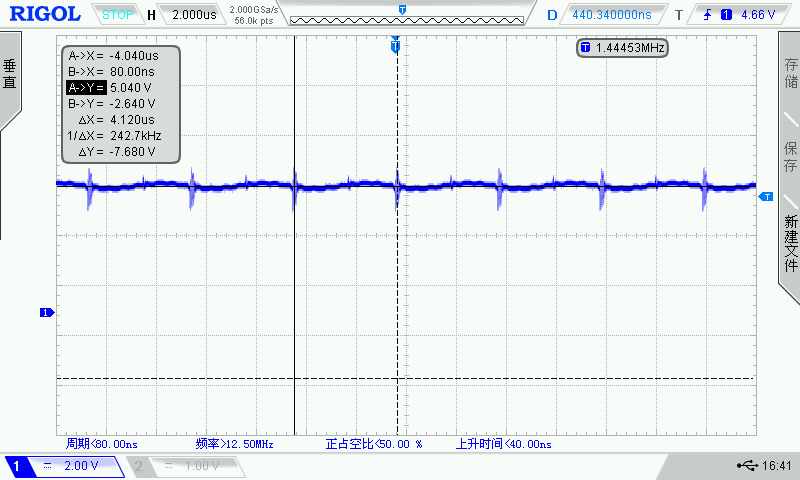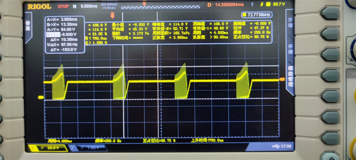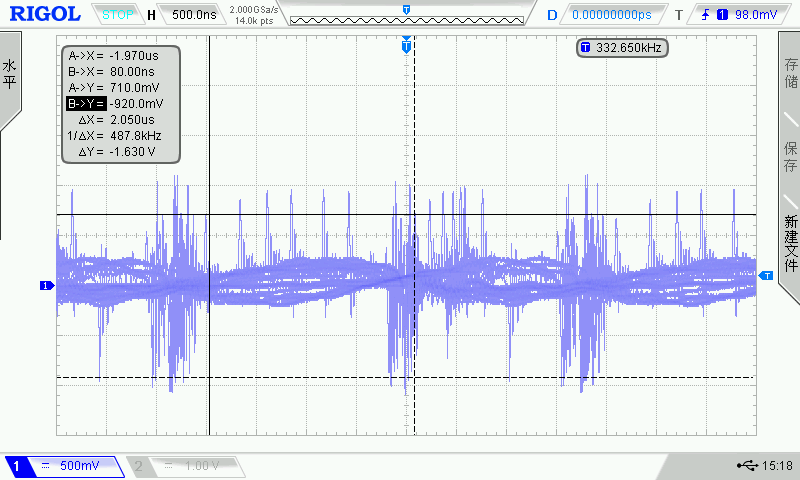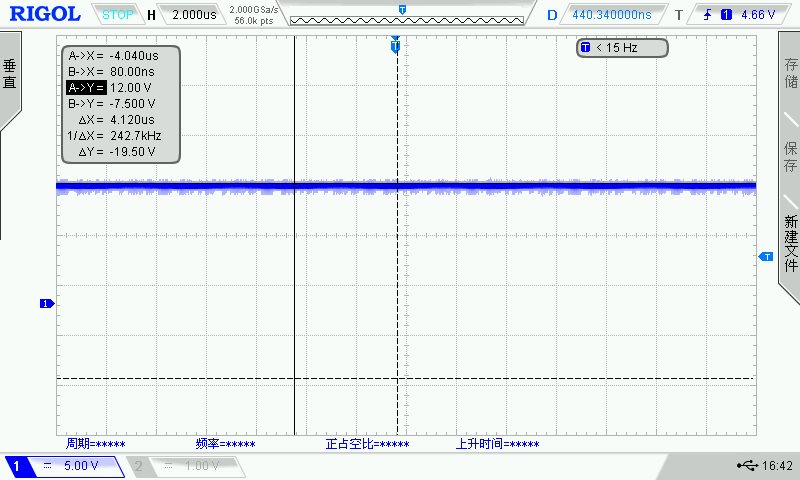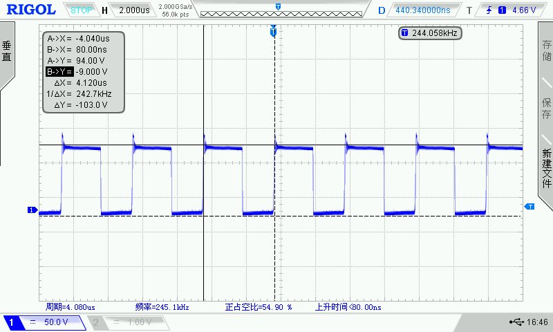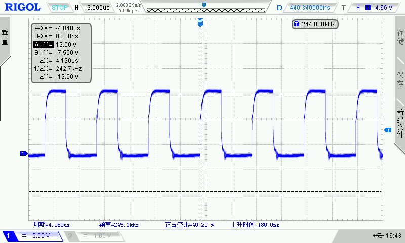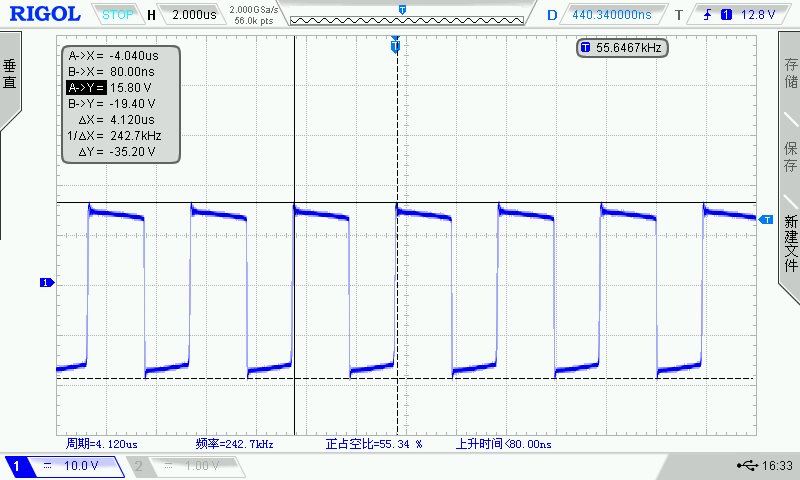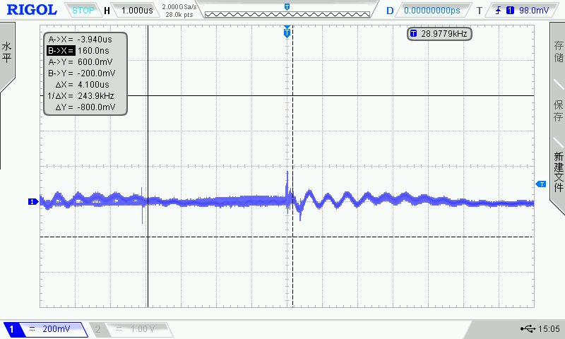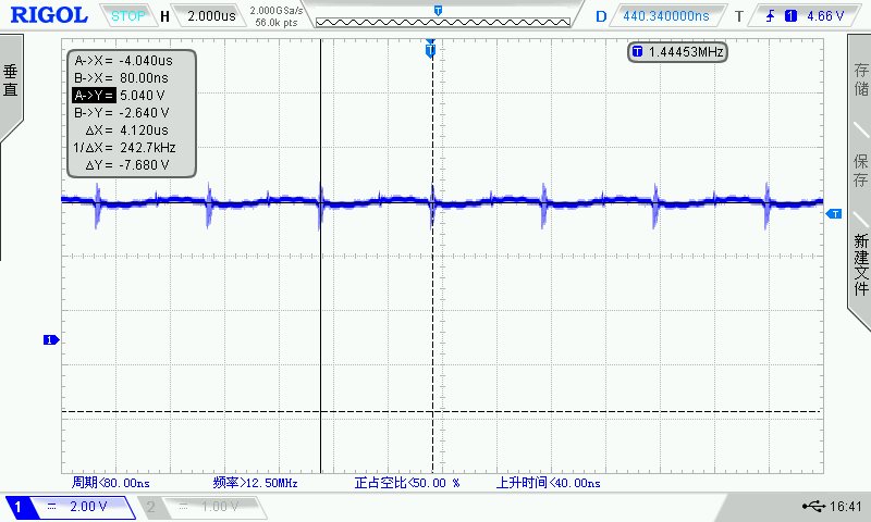 2. 连接负载,可以稳定的工作在18W以下,但超过20W很短的时间就会输出异常,MOS会进入打嗝模式,如图 异常打嗝MOS D端信号;
