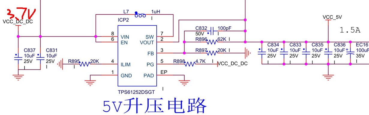 TPS61252带载时(5V转12V电源模块、运放等、5V ADC等,)负载约0.25A。此时输入电压3.7V拉垮至2.8V,输出5V电压只有2.2V,电感发出吱吱响声