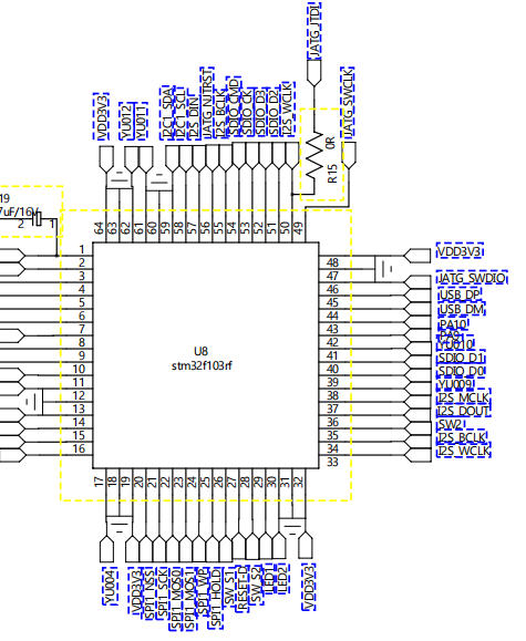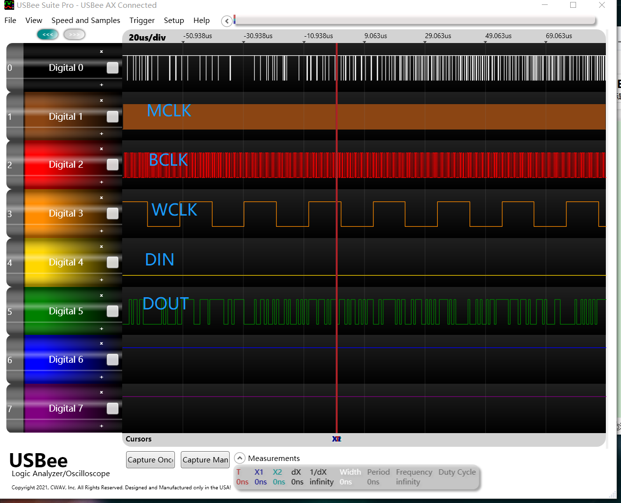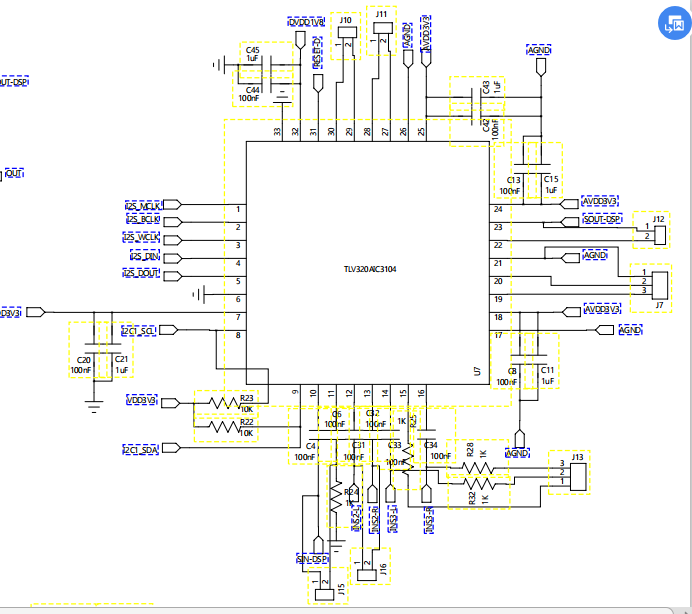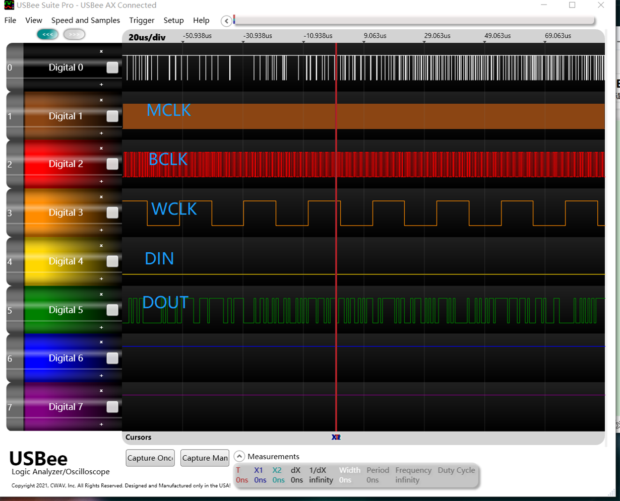 现象 使用STM32F104RE 做master tlv320aic3104 做slave ,参照datasheet配置完成后,再没有输入接入或者输入接地的情况下,I2S DOUT上有大量数据产生,正常输入波形信号也不能改变