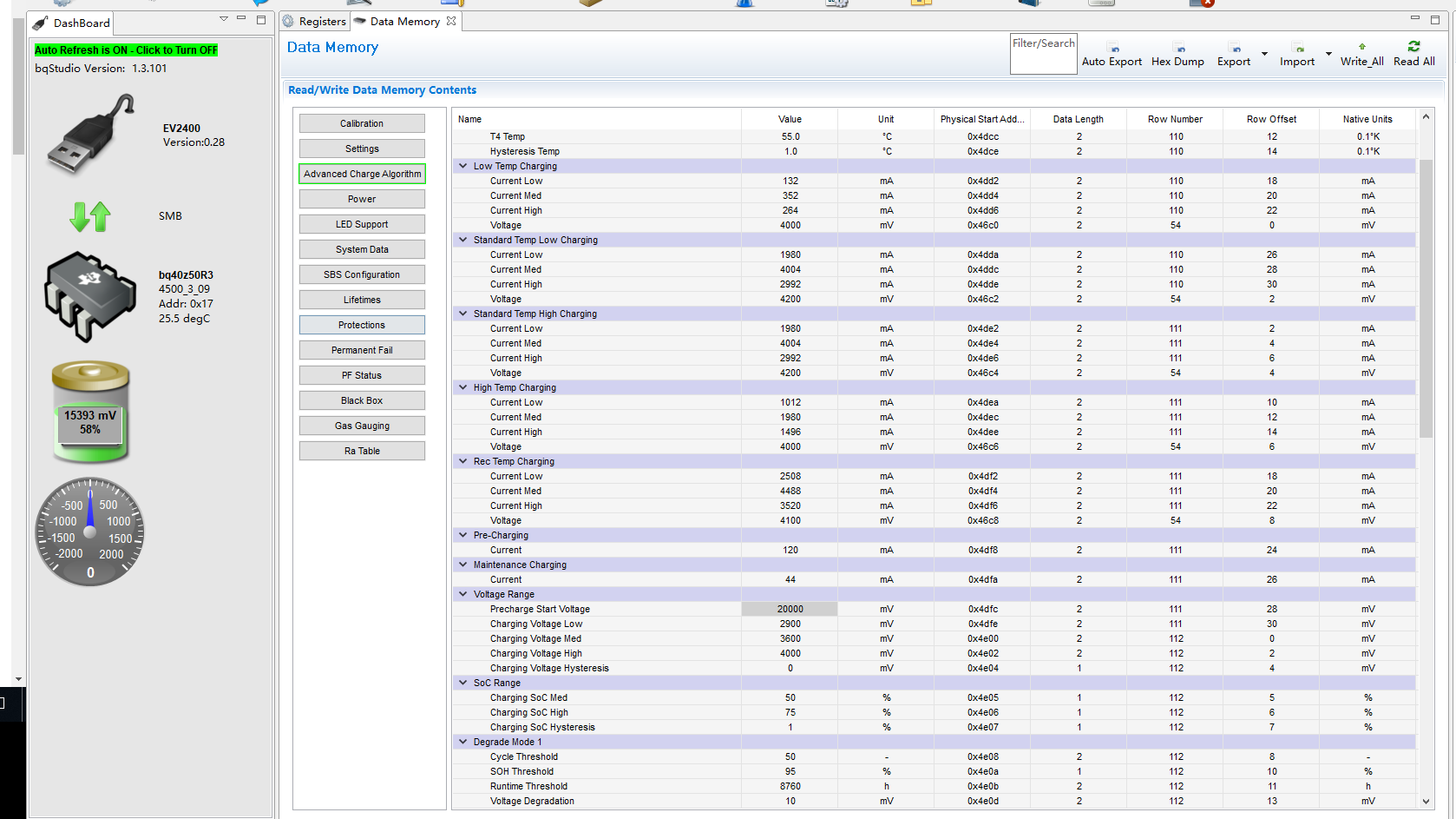 当BQ40Z50 的预充电功能打开 PCHG_COMM =1 的时候 如下图 我当前电压是15393mv 我设置 Voltage Rang 下面的Precharg Start Voltage 预充电电压为20000mv(20V),我当前电压是15v 按照文档的介绍PCHG这个MOS管应该会自动打开进行充电,但是实现没有发生,请问是还需要设置什么东西吗? 还是本来就不会自动打开这个mos管?