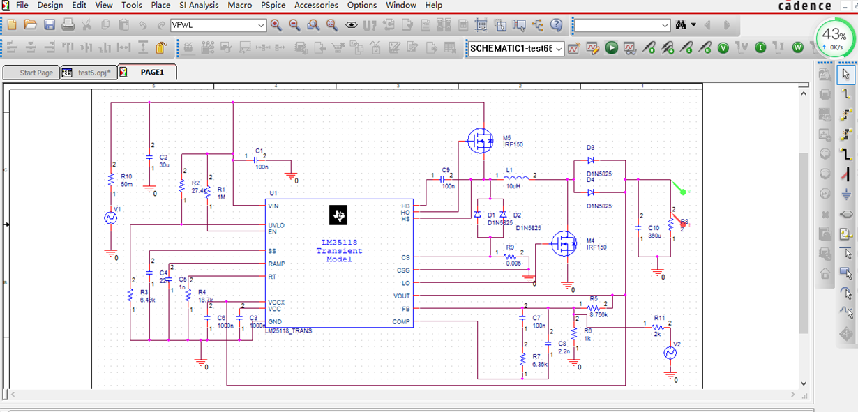 我使用LM25118提供的spice模型进行仿真,输入电压30V,通过DAC控制调节FB端来改变输出电压1-16V之间变化。大约在设定输出电压为4V左右时输出的实际电压振荡较大,在其它区段都相对比较稳定。请问是为什么,能怎么改进来减少这种不稳定?