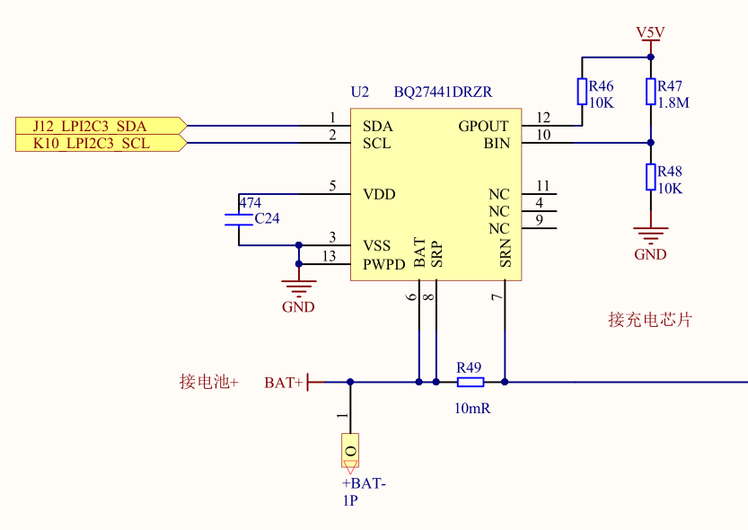 系统不上电,测量bq27441 vss与vdd两端的电压为1.7v,但是系统一上电,电压为0,i2c一直通讯不了,i2c 的上拉是3.3v。电路图如下,可能是什么原因?
