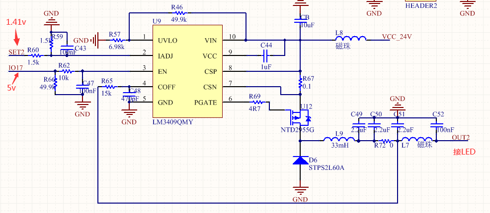 使用LM3409HVMY芯片在板子上做的两路LED驱动,板子做的4层板所有接地信号都是通过过孔直接到地层,目前发现当我打开一路led驱动时,驱动电路发热不烫手;当我同时开启两路led驱动时,接通5分钟板子就非常烫,不能用手摸,主要发热的地方就是LM3409,NMOS管,电感。驱动的输入是24V,采用模拟量调光方式,点亮led后测得led电压为12.3v,电路图如下: