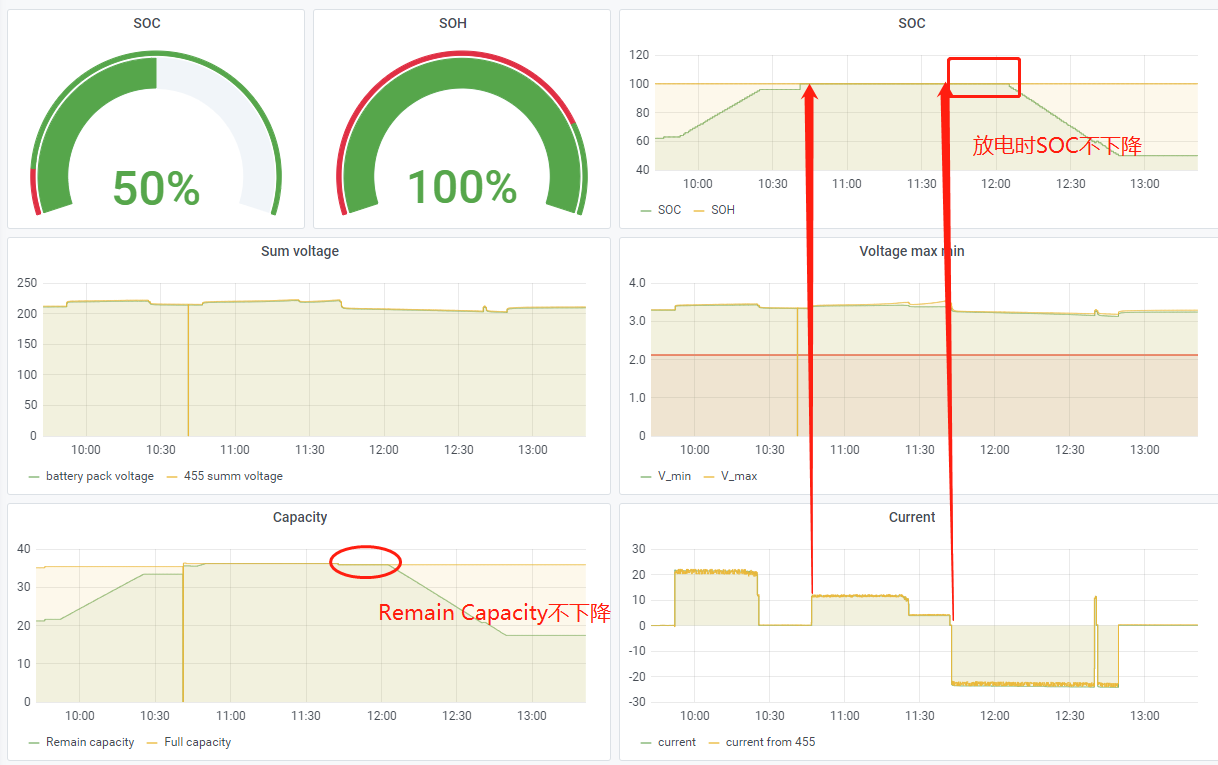 现象:初始上电时,SOC会存在不准的现象(正常现象),而在SOC达到100%之后,继续充电直至最高电芯电压达到充电截止电压(3.55V)。此时立即放电,SOC会保持20分钟不下降,此时剩余容量也不更新。