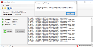 我们从 BQ studio更改了电池容量、电池电压,然后生成了一个烧录文件,连接好了BQ27220的EVM、电池、EV2400,通过Launch Smartflash Software能正常的连接上BQ27220的EVM,但是无法完成烧录。