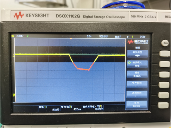②异常现象:PCBA正常上电后,V1V0_MGTAVCC的电压会异常跌落,出现的频率有时1天1次,有时1个月也不一定会出现。电压跌落的波形见下图