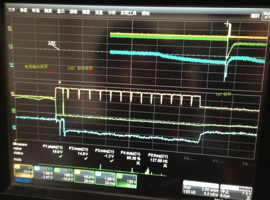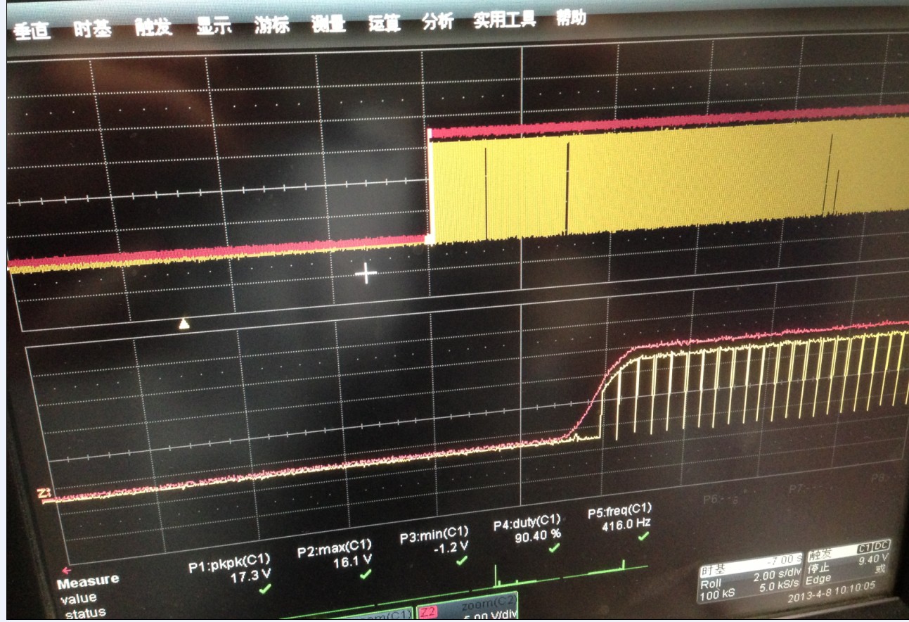最近在调试一个 用UCC3818 做的APFC电路,一开机电流就很大。怀疑软启动的问题,因为通过量测开机启动波形,发现一开机驱动高占空比达到90%以上。有把SS脚的电容加很大了,测它开机电压也上升很慢,但驱动波形开机马上就有,而且占空比90%以上(看芯片规格书里面的描述应该是开机后占空比会慢慢打开的)。如果装上IGBT ,就会烧掉。请教下各位有遇到类似情况的吗?问题一般出在哪里?多谢了。附件中黄色为驱动波形。红色为SS脚电压波形。