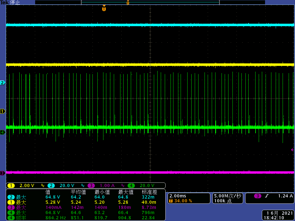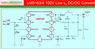 设计电路图1;LM5164官方提供的参考设计图2;空载0mAb波形图3;中载500mA图4;满载1000mA图5(CH1:SW CH2:Vout CH3:Iload)