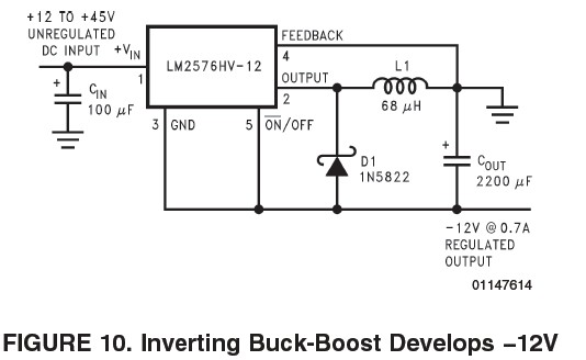 我用LM2576HV-12这款芯片。想产生-12v的电压。给运放供电。按照数据手册中电路做了个小板子。但怎么也不能产生-12v的电压。于是请大家帮帮忙,看是什么地方出问题了。